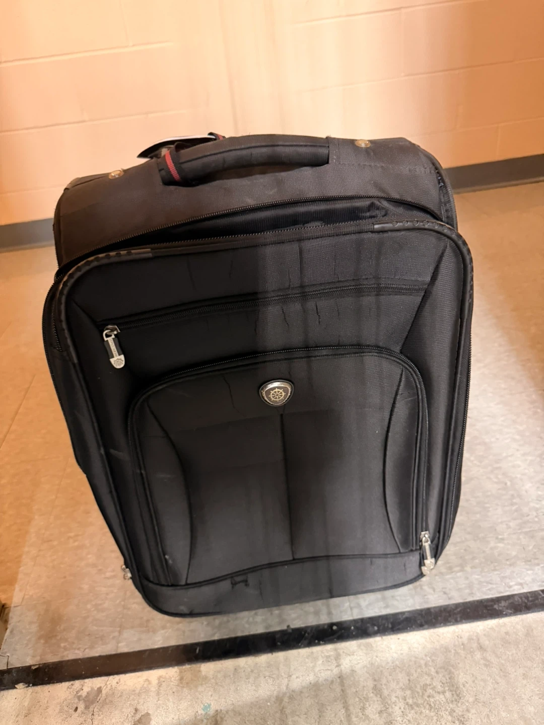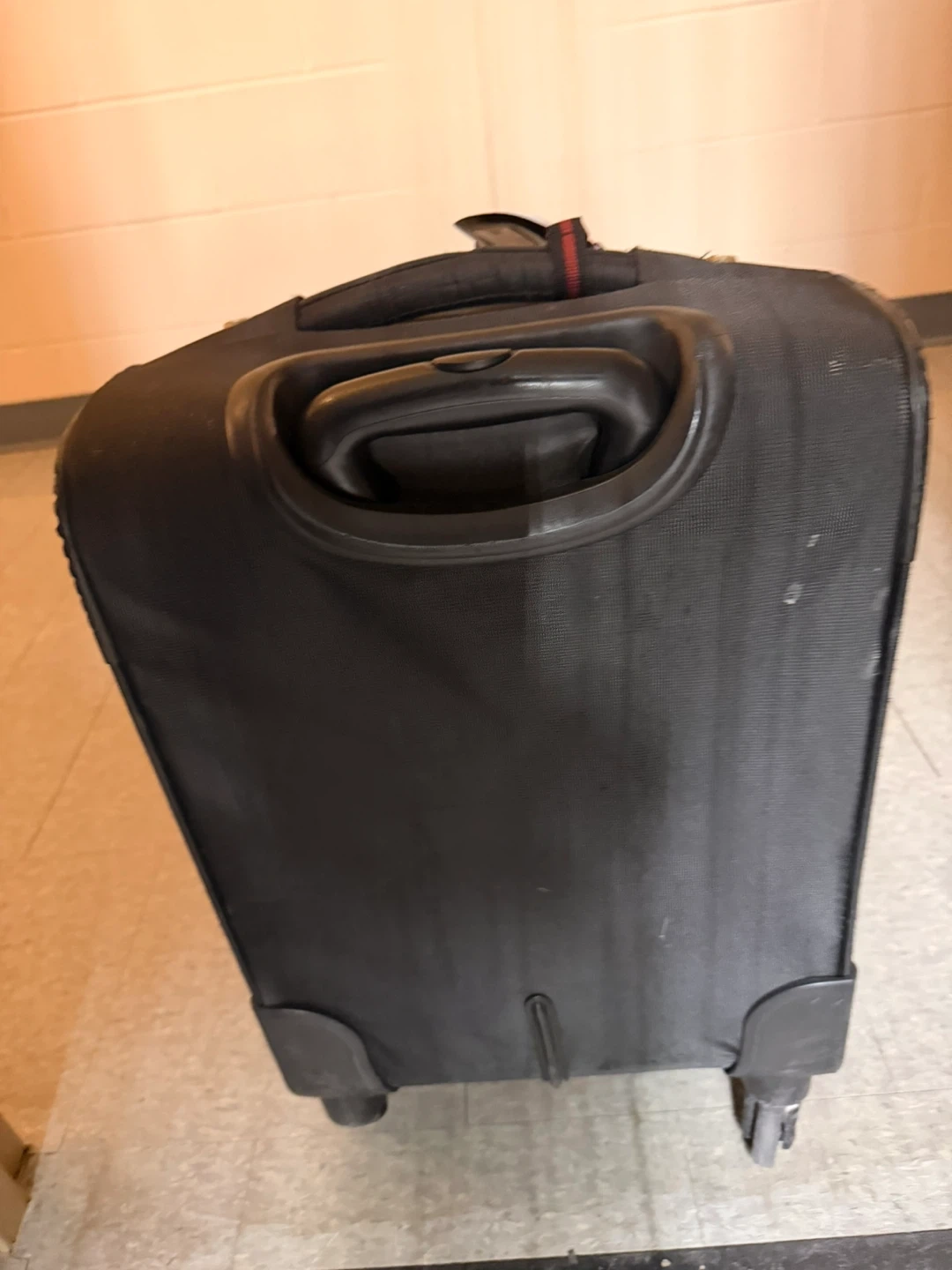 Black rolling suitcase in good condition! Perfect for travel or storage. Has a few scuffs from use, but still works great