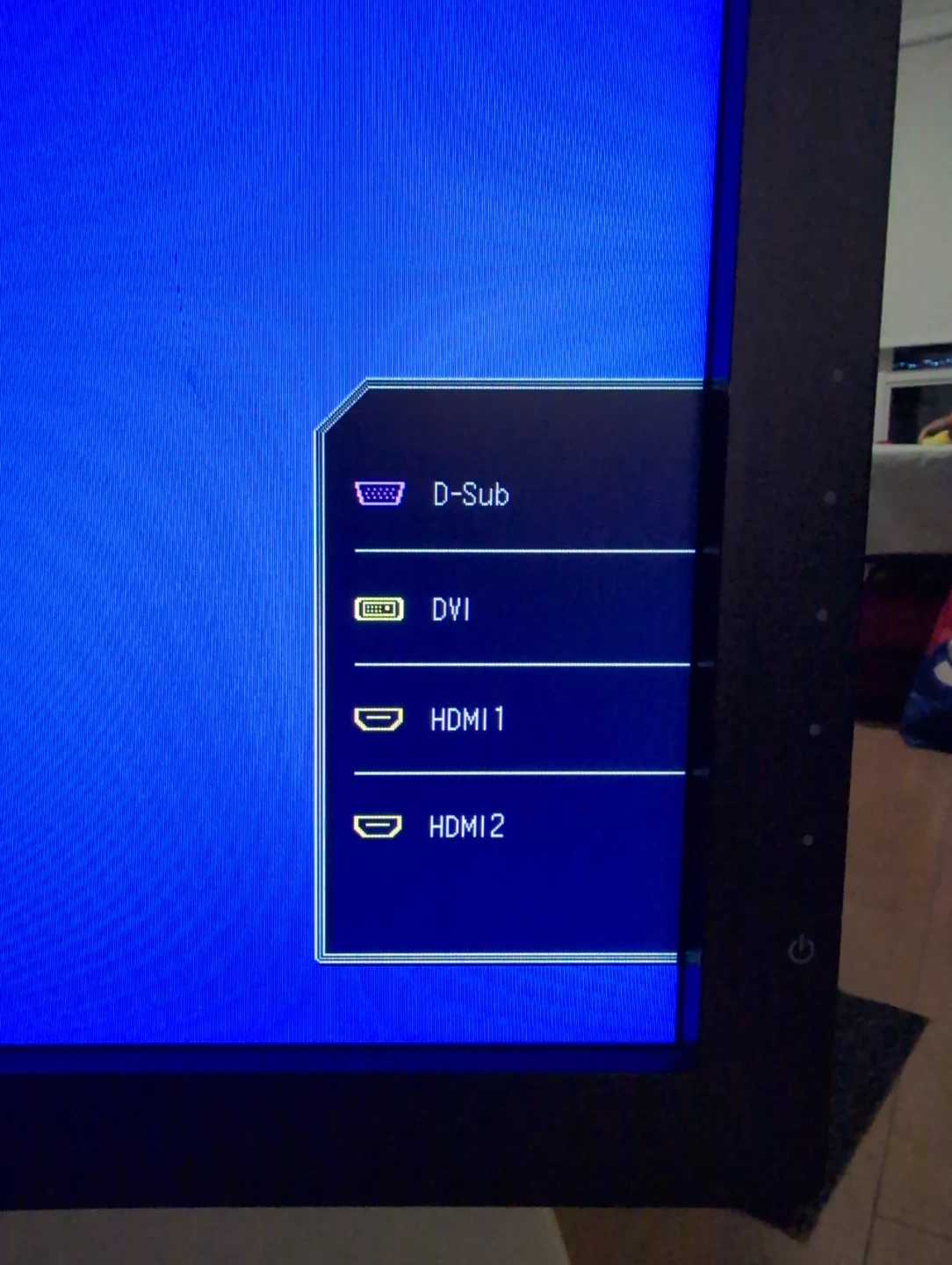 It has VGA, DVI-D, HDMI 1, and HDMI 2 ports.