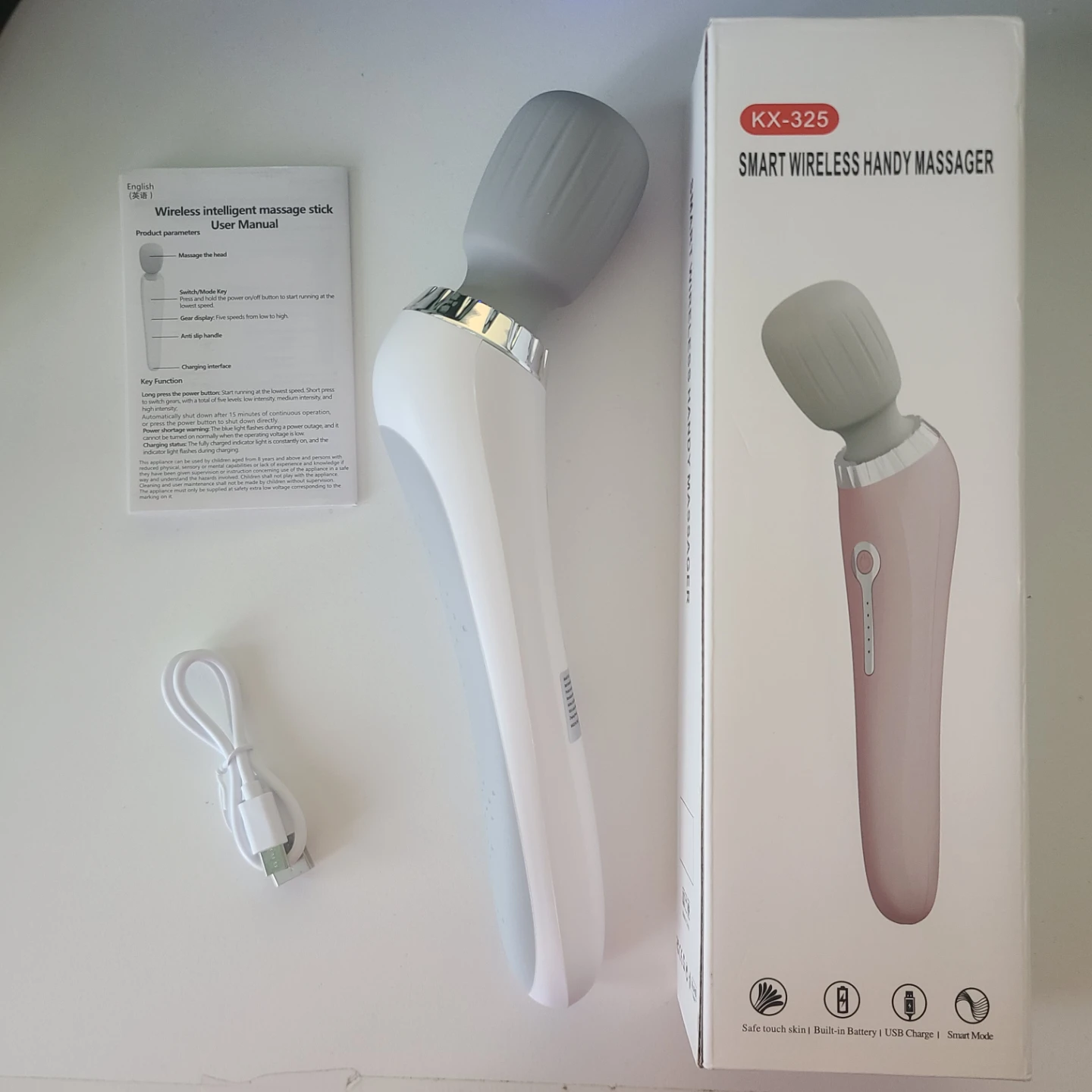 Selling a KX-325 Smart Wireless Handy Massager. It comes with the user manual. The massager has five speeds from low to high, and features an anti-slip handle. It also has a built-in battery and USB charging cable.