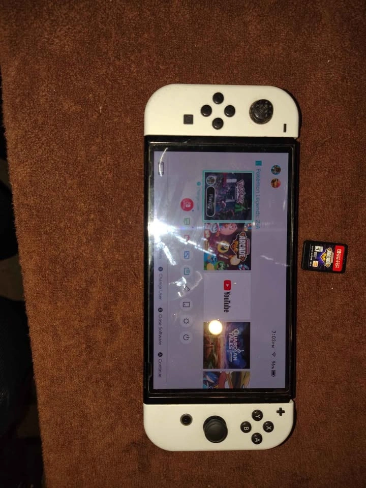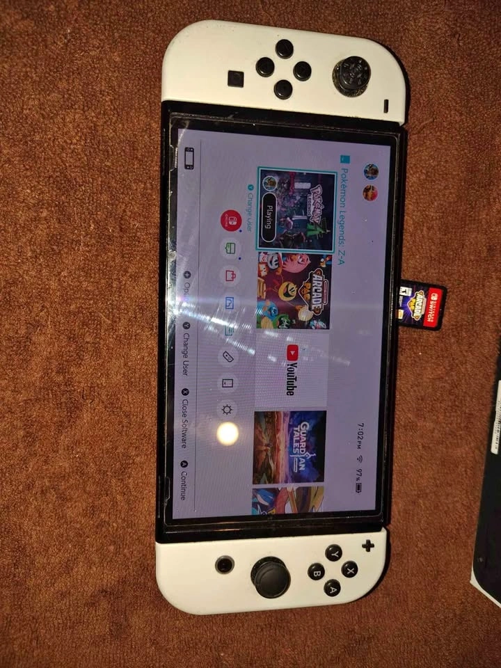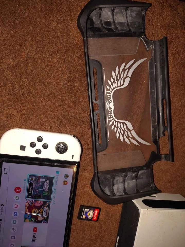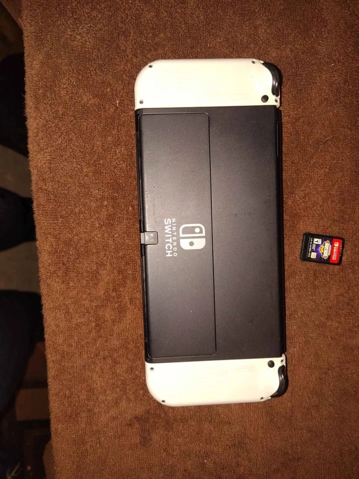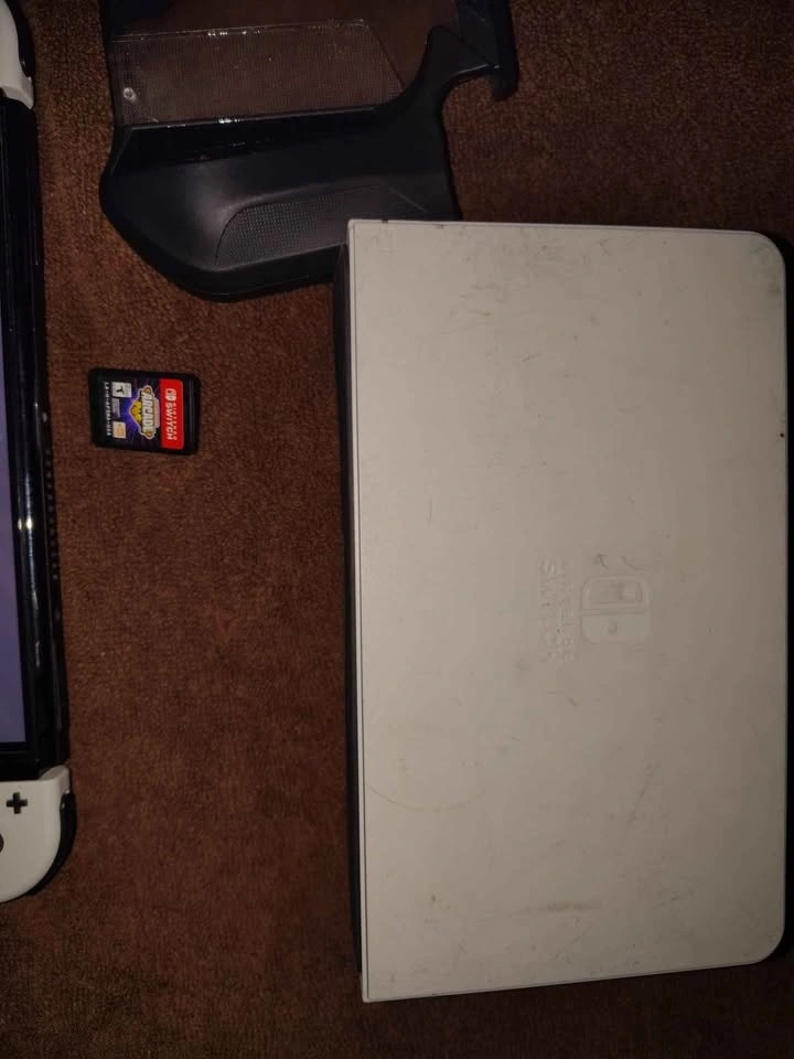 Nintendo switch OLED, comes with one game arcade pac, the original dock (untested never used ), original charger, carrying case ,and a case for the switch. The switch has a screen protector on it, and is missing the rubber on the left joystick. All buttons and analogs work perfectly can get a replacement for a few bucks on Amazon. Switch will be fully charged at meet up to test.