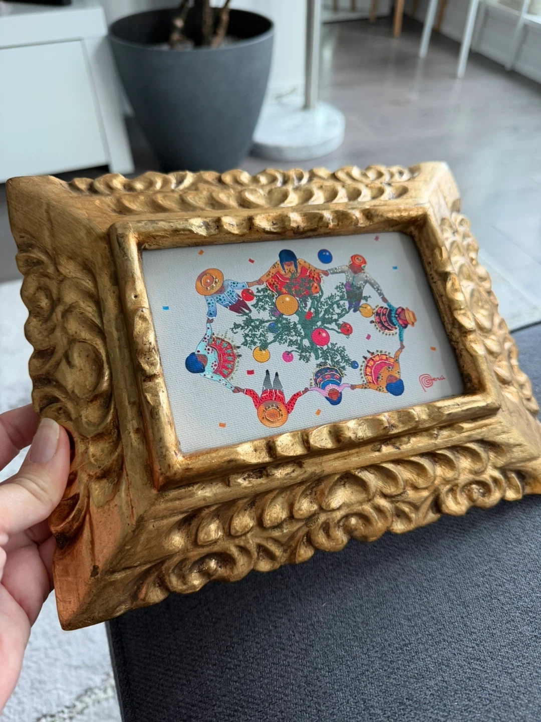 Selling a framed artwork piece from Peru. The frame is gold and ornate. It features a colourful illustration.