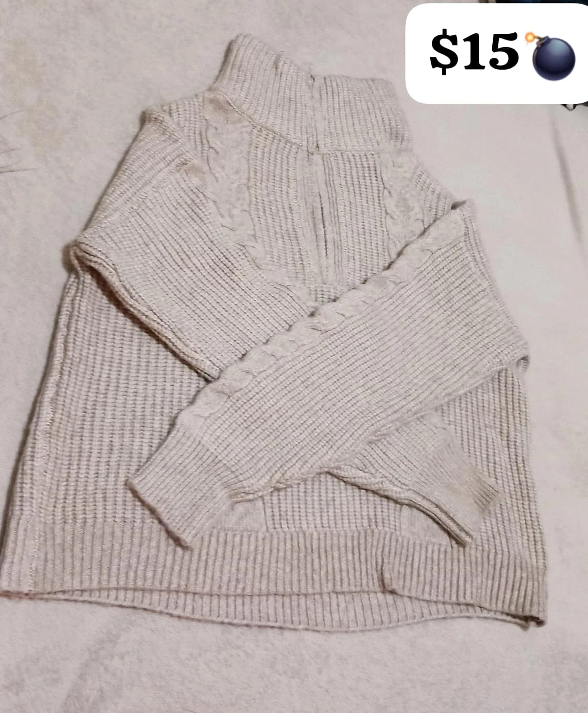 Selling a cozy cable knit quarter zip sweater! It's in great condition and ready to keep you warm. It's a neutral color that goes with everything
