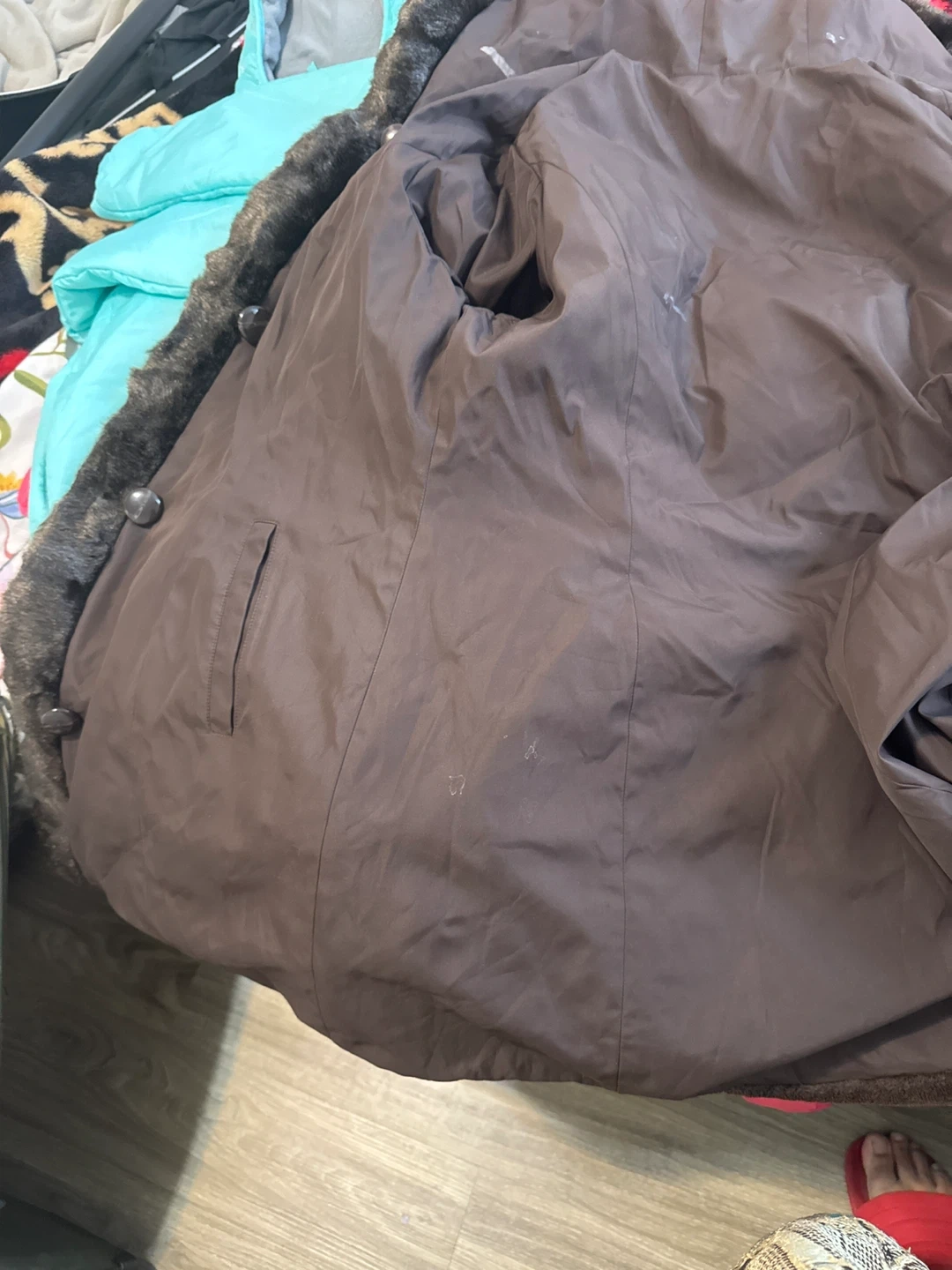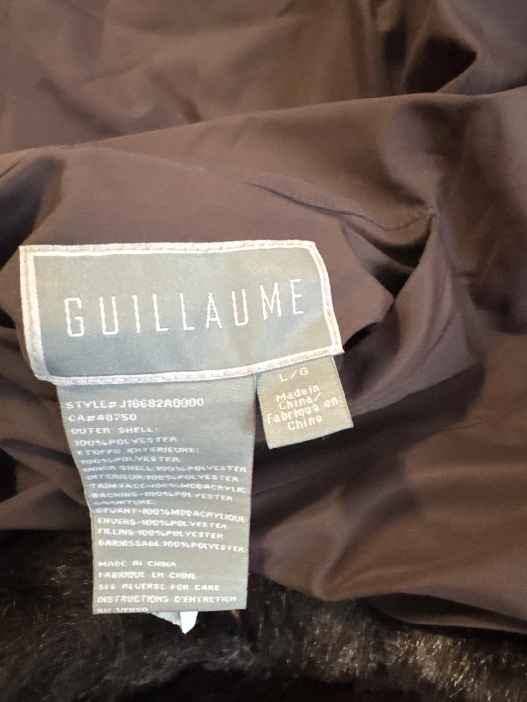 Cozy Guillaume coat with faux fur trim in a lovely brown colour! It's a size L/G and made in China. The outer shell is 100% polyester, so it's nice and durable. Perfect for staying warm and stylish during the colder months