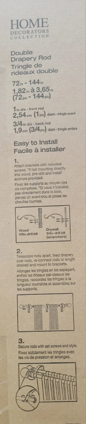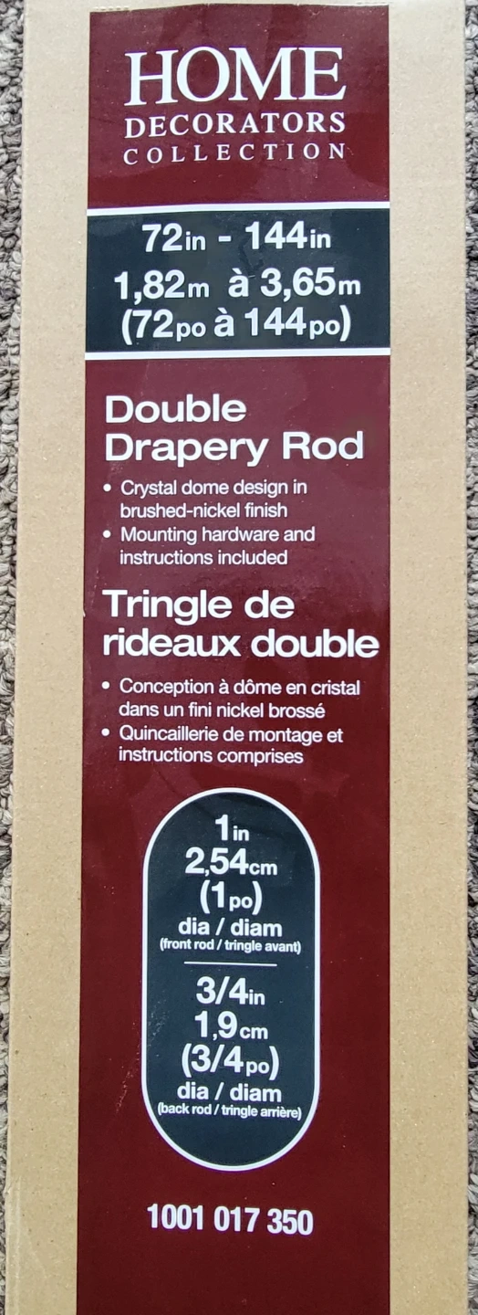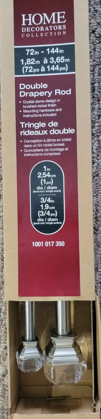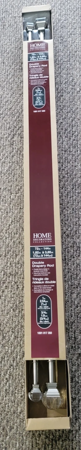 Selling a Home Decorators Collection double drapery rod, perfect for adding a touch of elegance to your windows! It can extend from 72 inches to 144 inches (1.82m to 3.65m). The crystal dome design with a brushed-nickel finish will complement any decor. Mounting hardware and instructions are included for easy installation