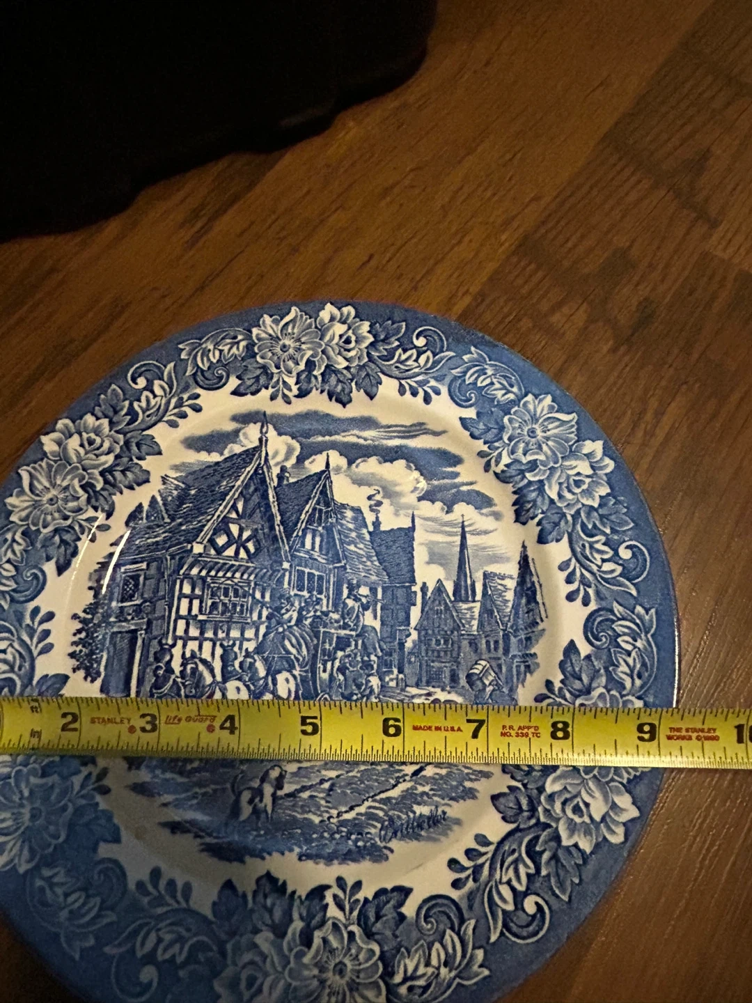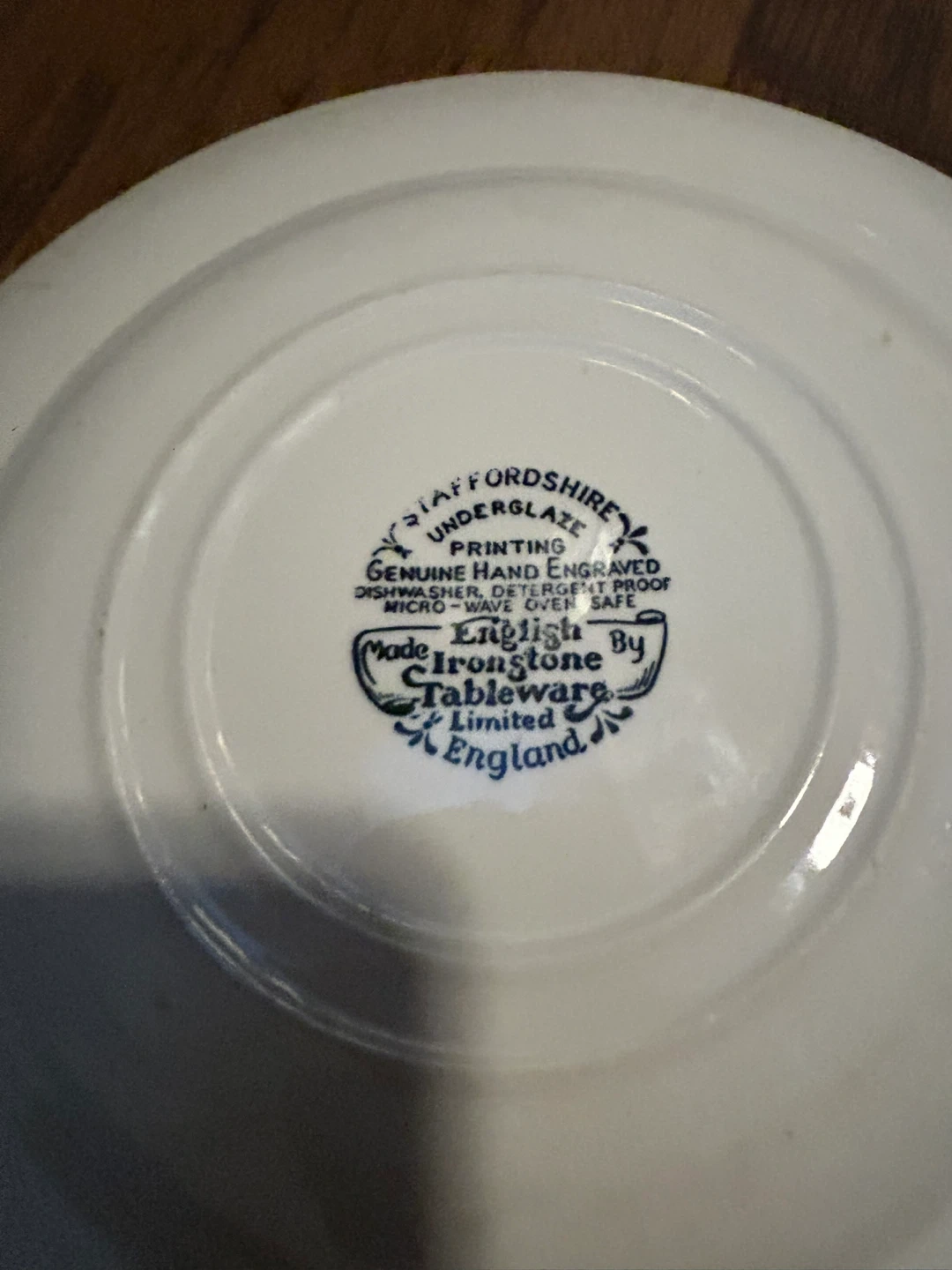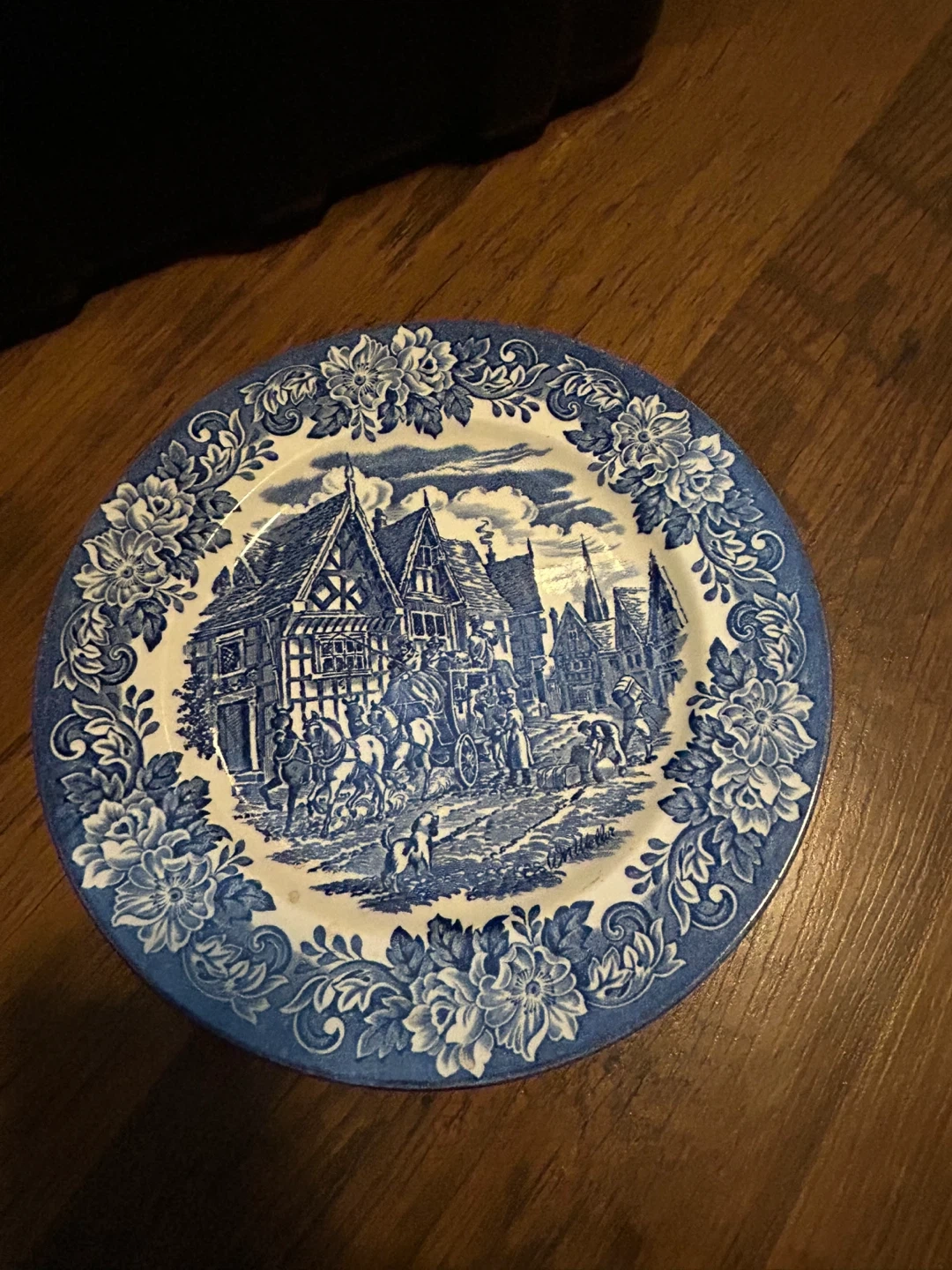 Selling a lovely Staffordshire Ironstone Tableware plate! It features a beautiful blue and white design with a scene of English village life. It's dishwasher and microwave safe, plus it measures about 9 inches across