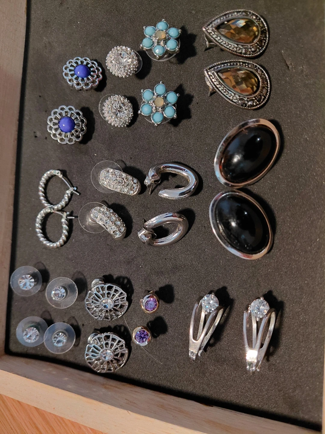A collection of assorted earrings in various styles and colours! All in silver setting with diamond, purple, blue, and yellow and black simulantv stones available. Perfect for adding a little sparkle to your day. Comes with a lovely balsa wood storage box. $10 for all or $2 a pair. CASH ONLY. NO DELIVERY.