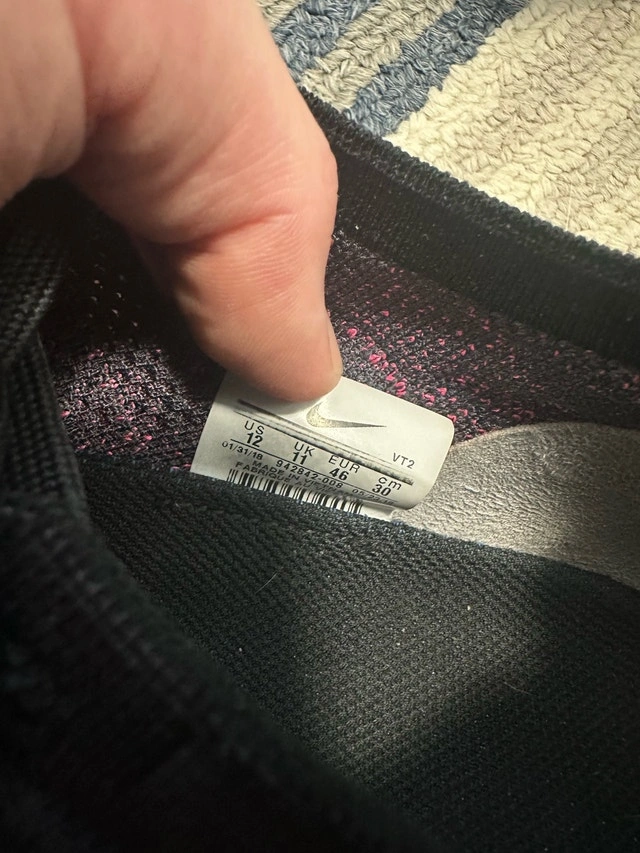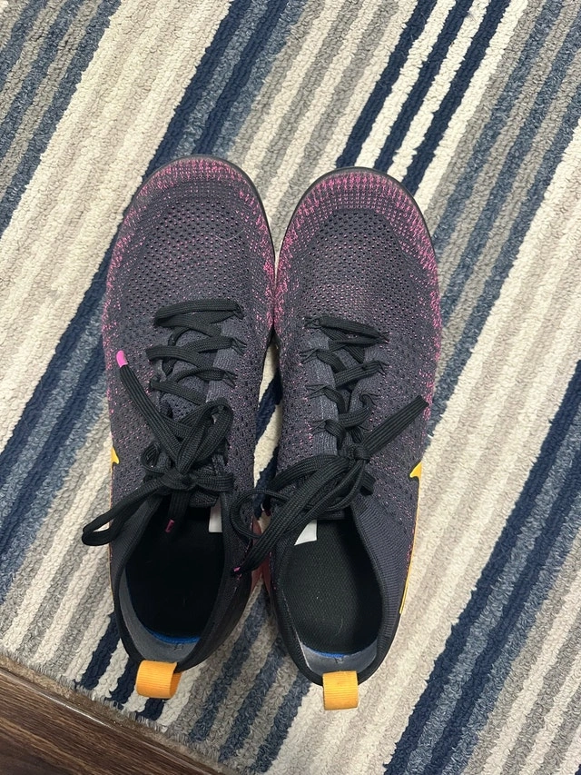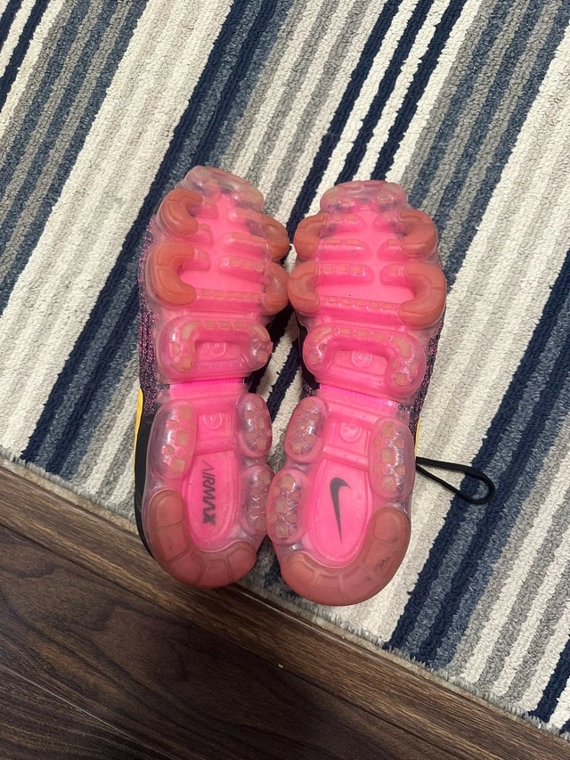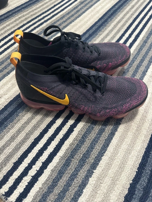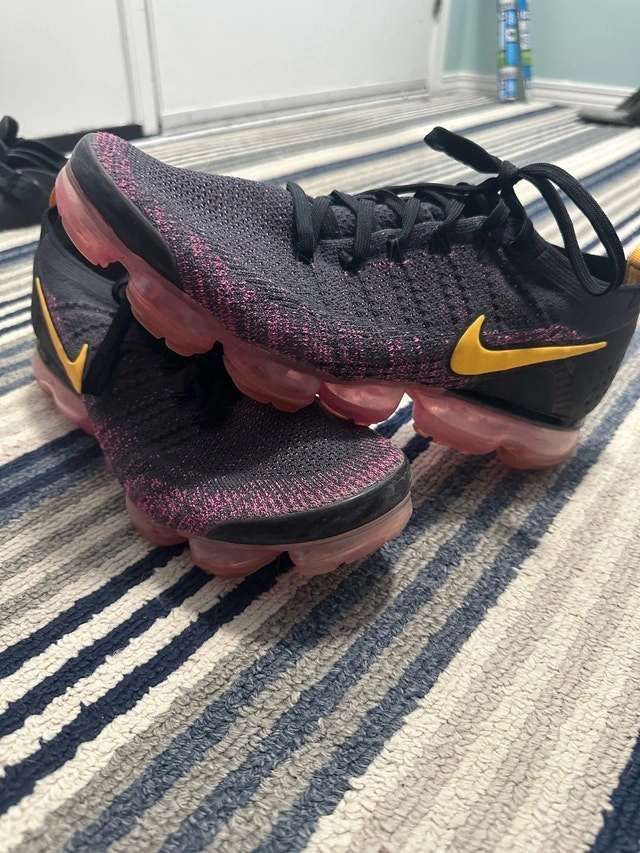 Get ready to fly with these used Nike Vapormax sneakers, size 12. The black and pink design with a gold swoosh are sure to turn heads, while the comfortable fit will keep you going all day long. Here are some more details: