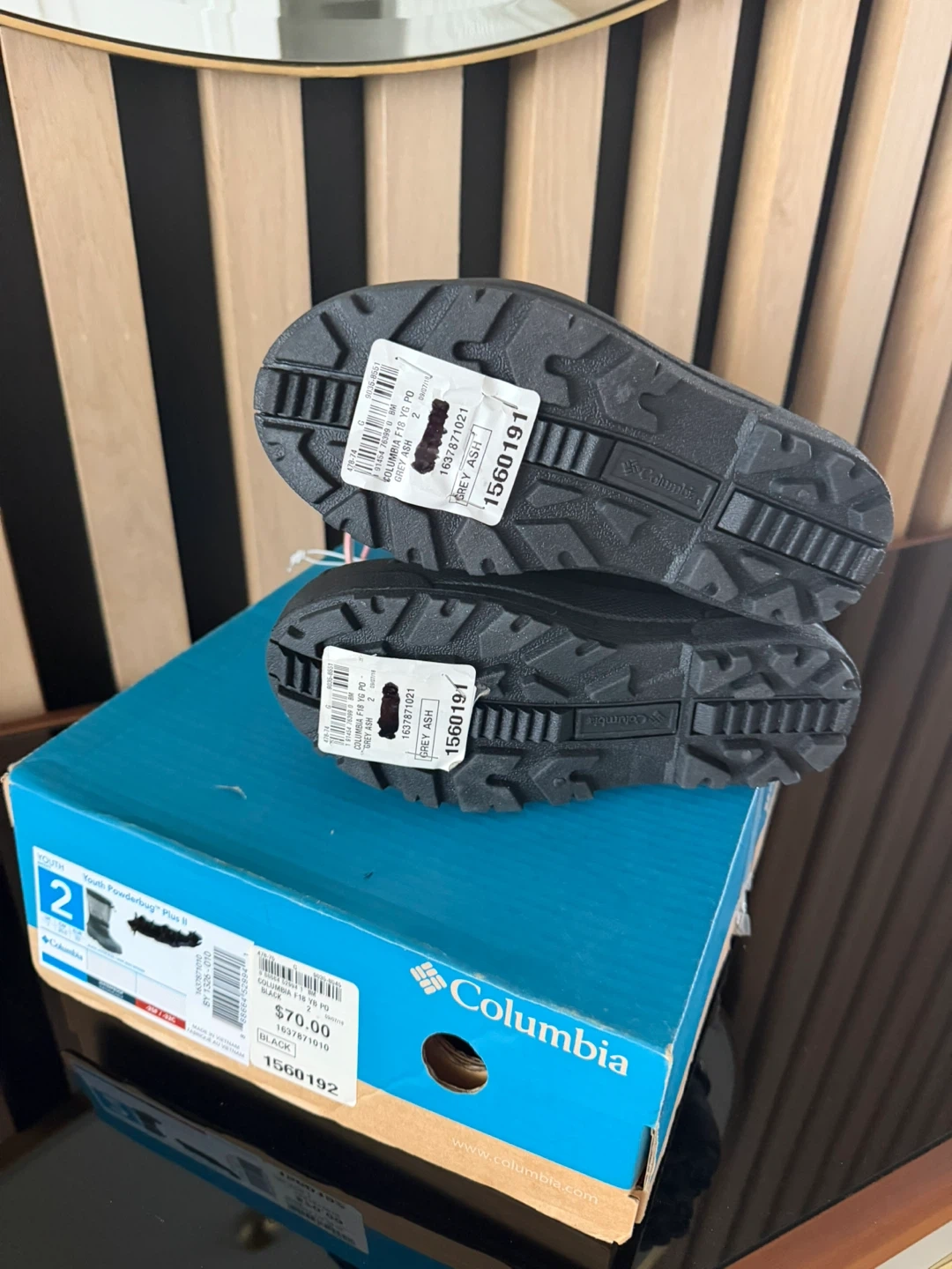 These Columbia Youth Powderbug Plus II snow boots are in excellent condition and ready for some winter fun! They come in a stylish grey ash and black colour, and are a size 2. The original box is included! Retail price is $84.