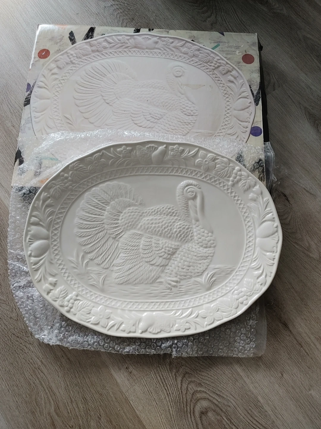 Serving platter, embossed with a detailed turkey design. It is perfect for holiday dinners or adding a touch of rustic charm to your table setting! It comes in their original box for easy storage.