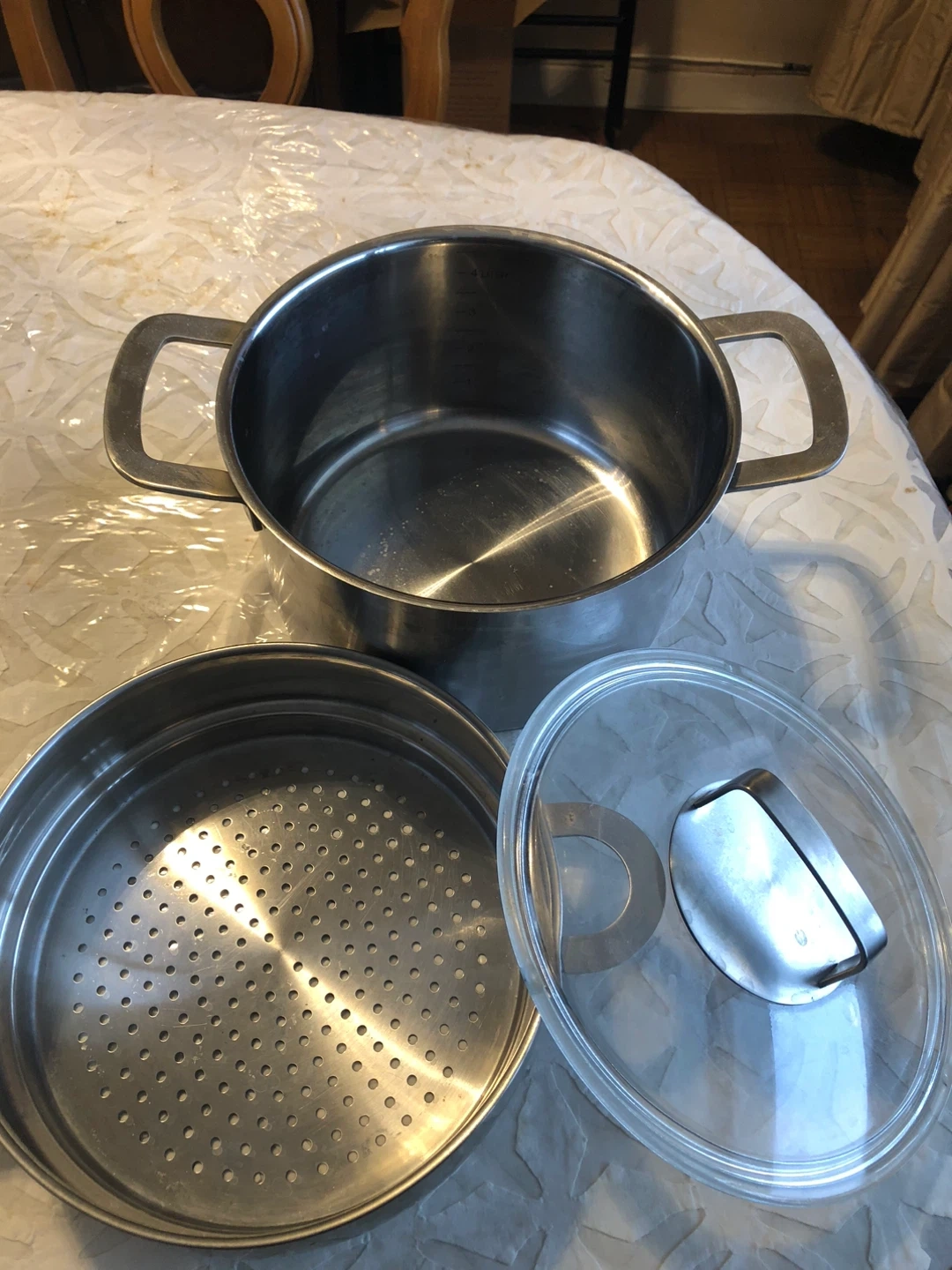 Selling a stainless steel steamer pot. It comes with a steamer insert and a glass lid. Great for cooking healthy meals!
