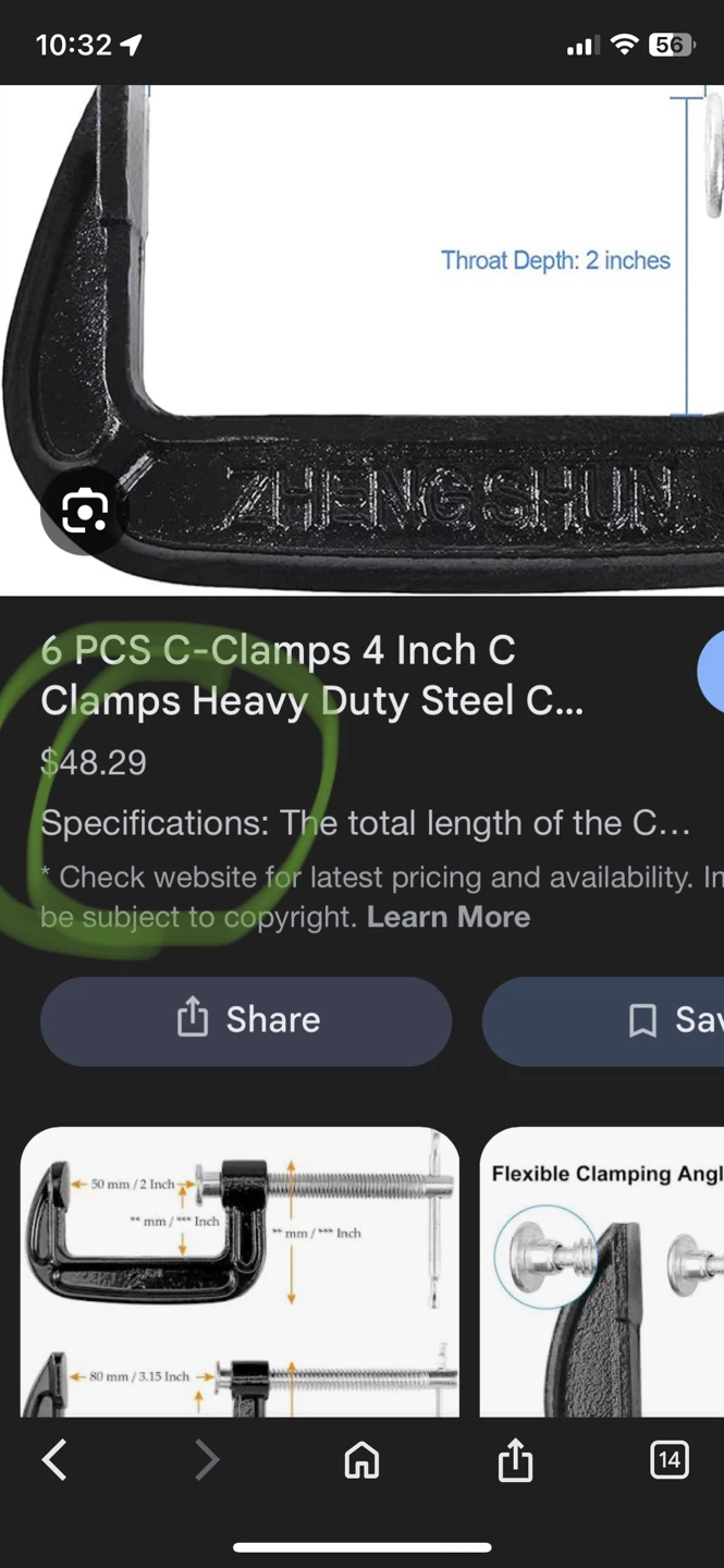 Selling a set of 6 C-clamps, each measuring 4 inches. These are heavy-duty steel clamps, perfect for a variety of projects. Originally bought for $48.29, they're still in their packaging.