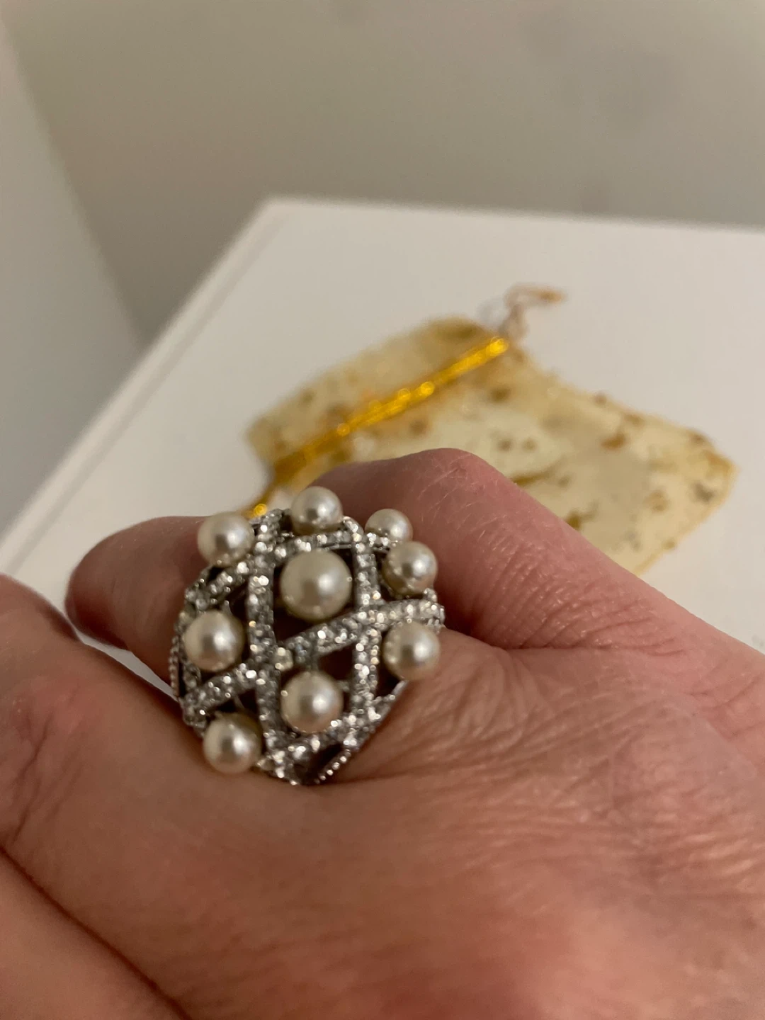 This is a beautiful statement ring featuring faux pearls and rhinestones. It's in great condition and comes in a cute little drawstring bag. Perfect for adding a touch of elegance to any outfit!
