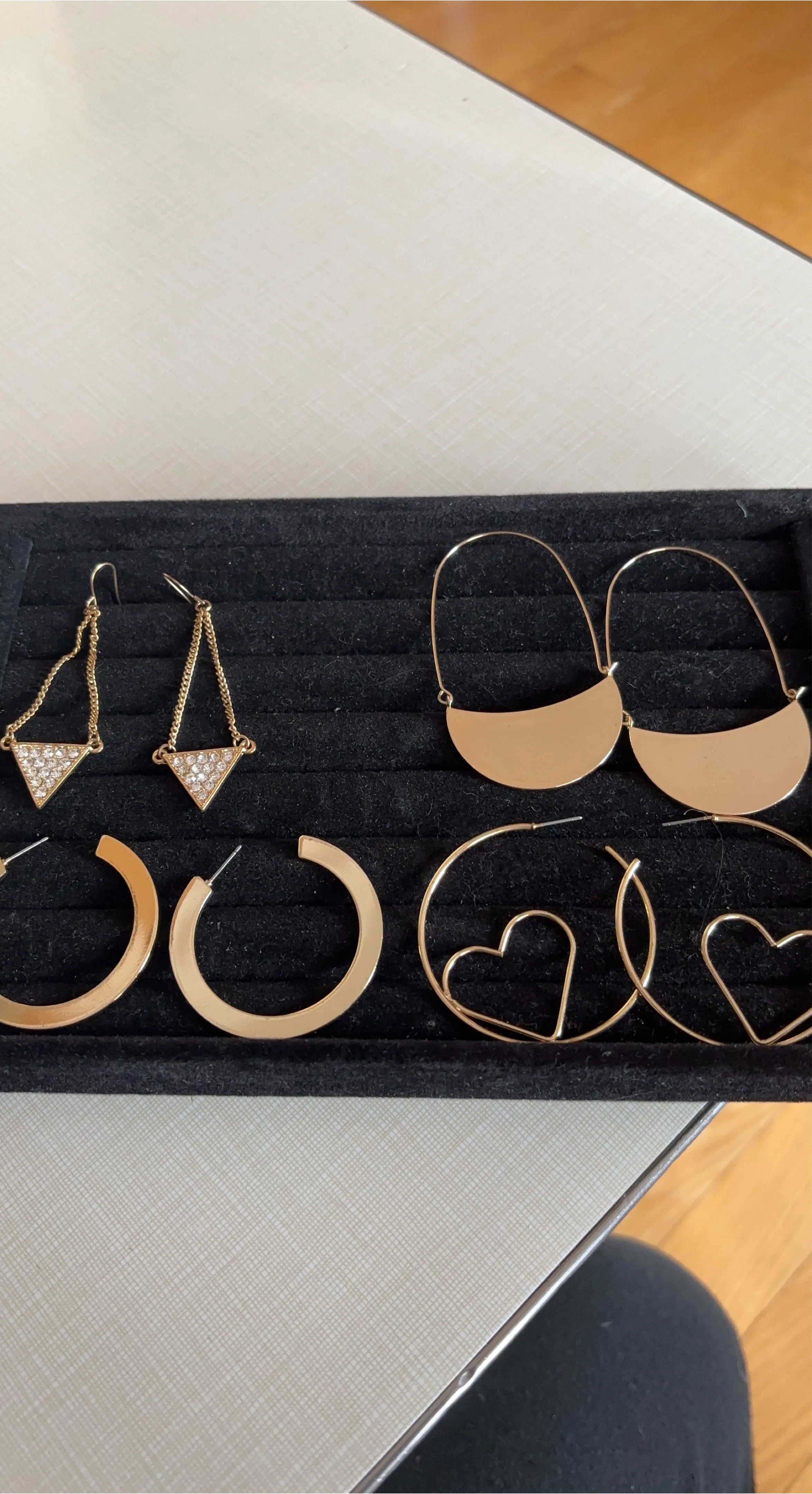 Selling a set of four pairs of gold-tone earrings. There are triangle drop earrings, hoop earrings, heart shaped earrings, and half moon earrings. They're in great condition and ready to accessorize your outfits!