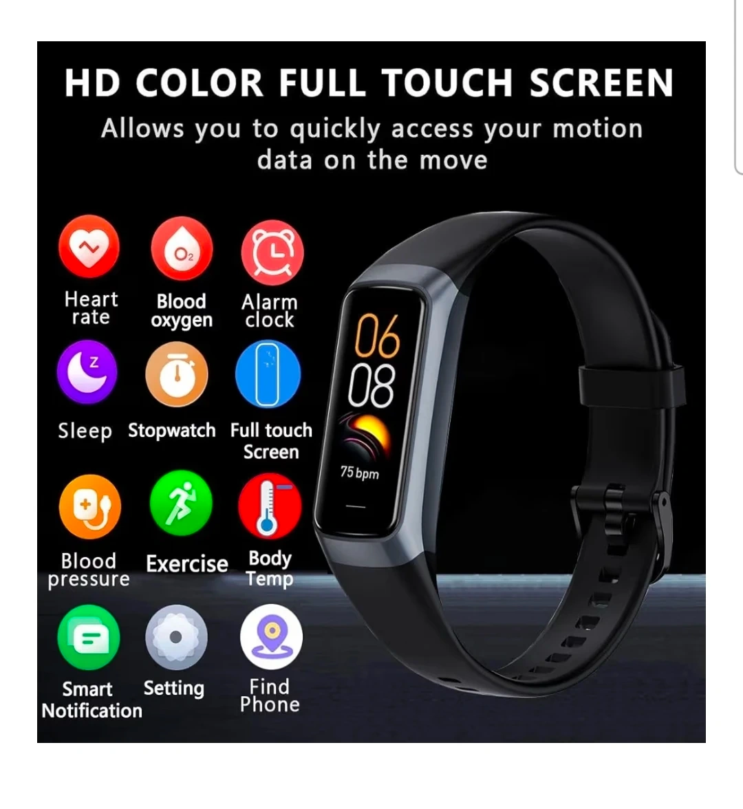Selling a new Fit Band fitness tracker! It comes with its original box. It has a HD colour full touch screen, and allows you to quickly access your motion data on the move. It tracks heart rate, blood oxygen, sleep, blood pressure, exercise, and body temperature. It also has alarm clock, stopwatch, smart notification and find phone features!