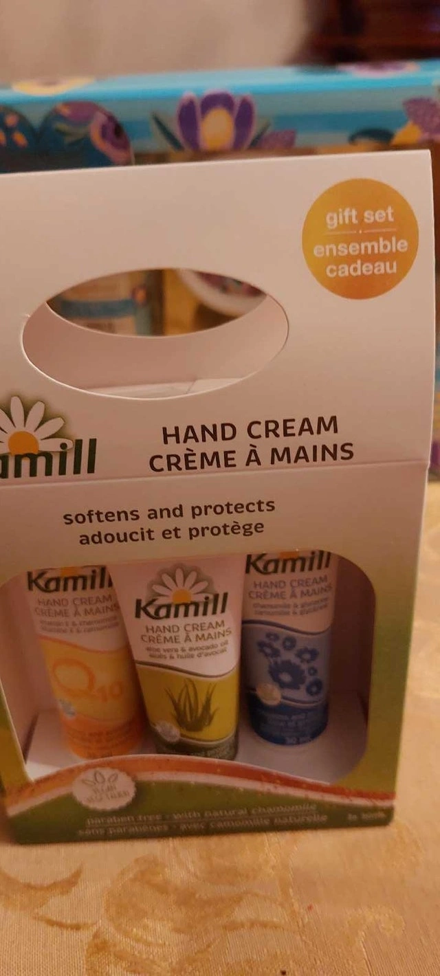 * Kamil hand cream set with three different, paraben-free, scents.