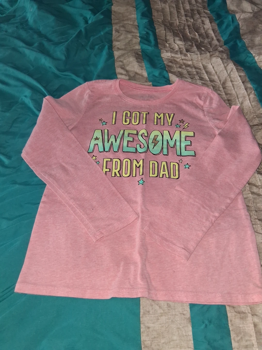 Here's a cute pink long-sleeve shirt from The Children's Place! It's a size L (10/12) and in great condition. The shirt has a fun design that says "I Got My Awesome From Dad". Perfect for your little one!