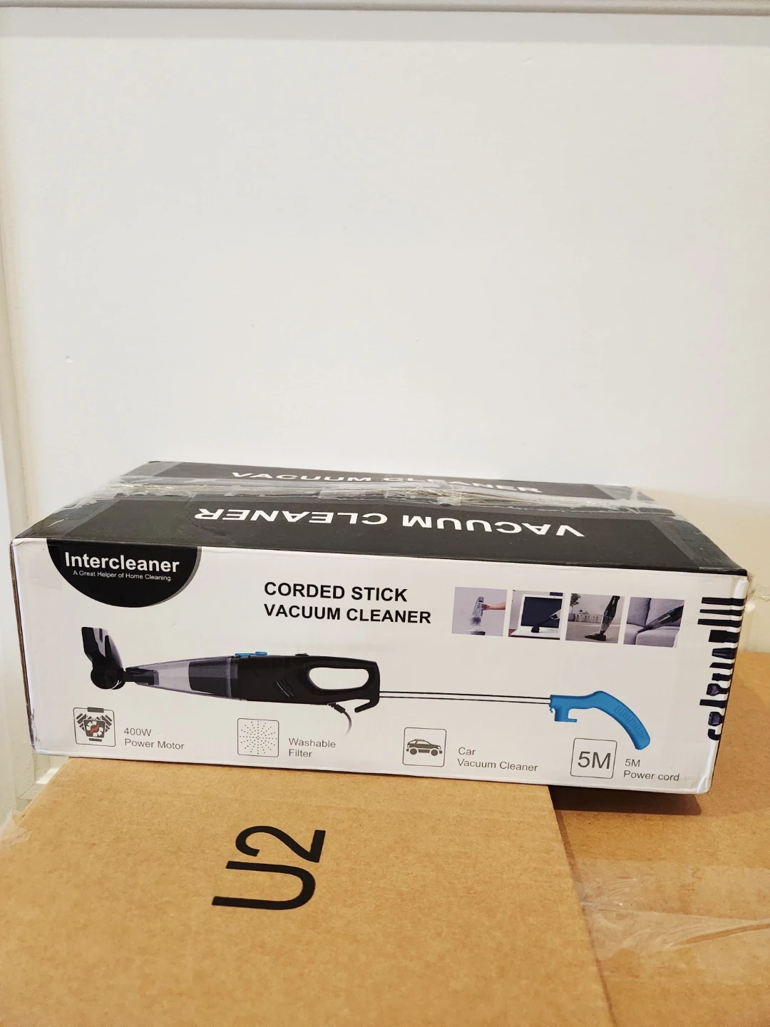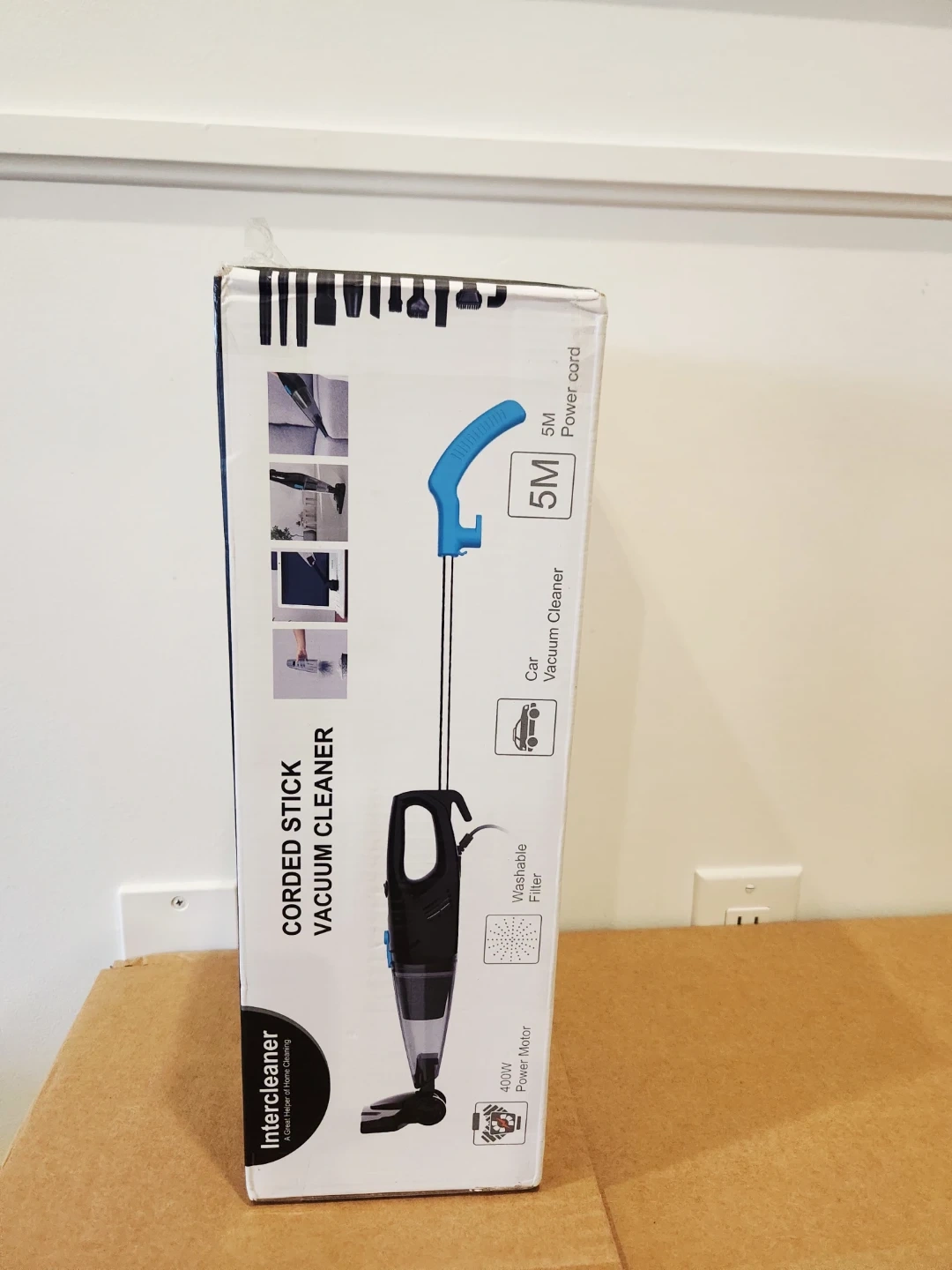 Selling a Intercleaner corded stick vacuum cleaner! It's still in its original box and ready for a new home. It features a 400W power motor and a washable filter. It also comes with a 5M power cord. It can be used as a car vacuum cleaner too! Open box item