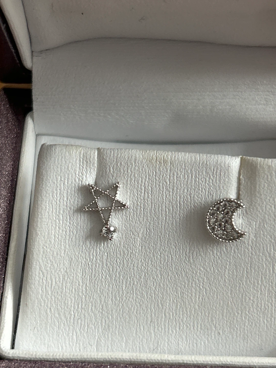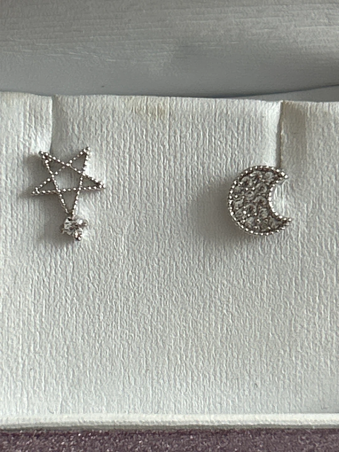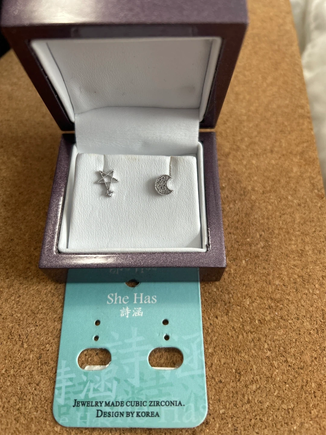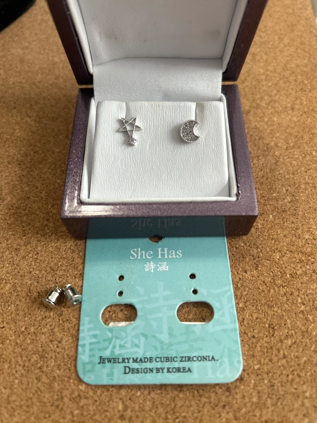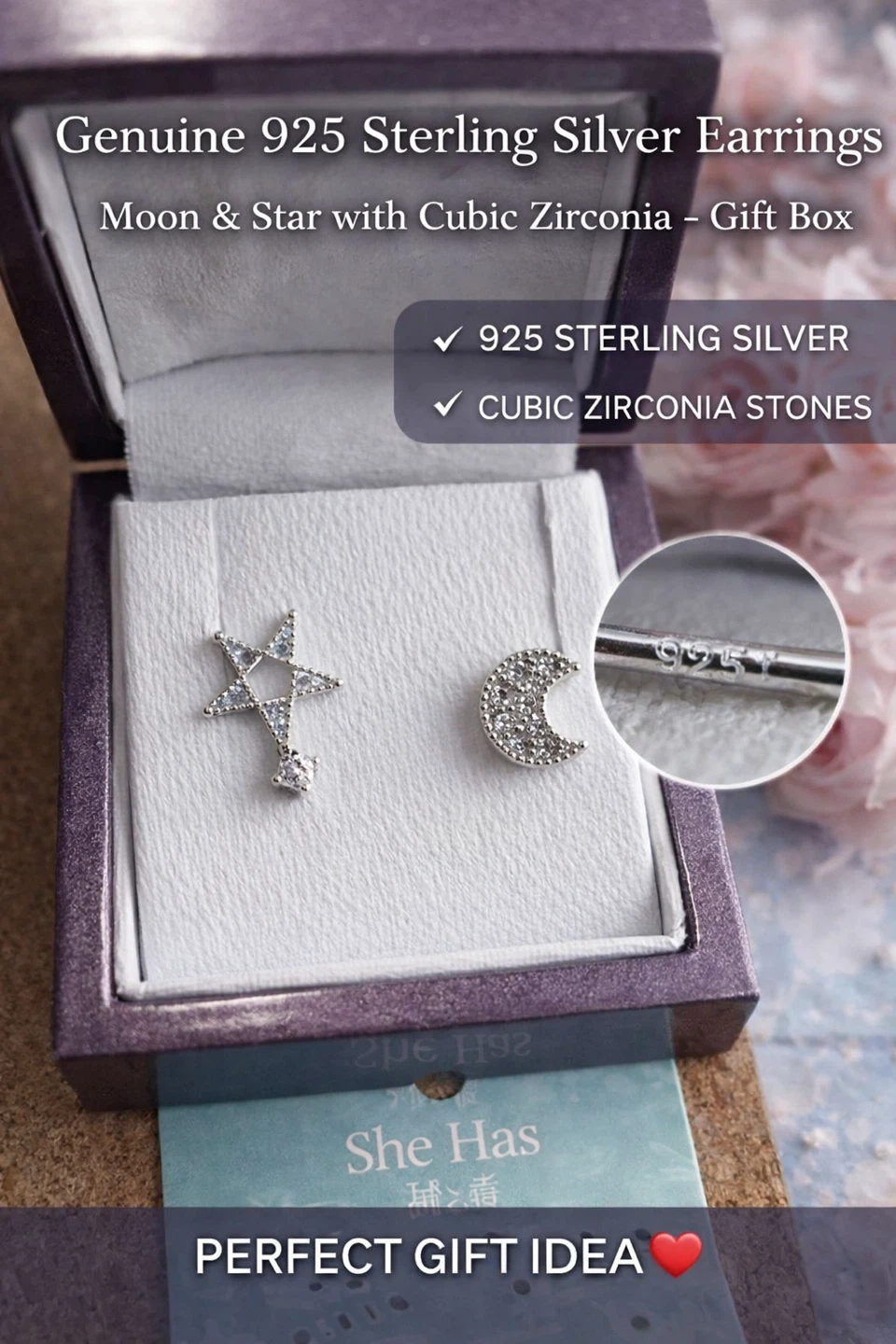 These are a pair of genuine 925 sterling silver earrings from She Has! They feature a moon and star design with cubic zirconia stones. Comes in a gift box, perfect as a present for someone special