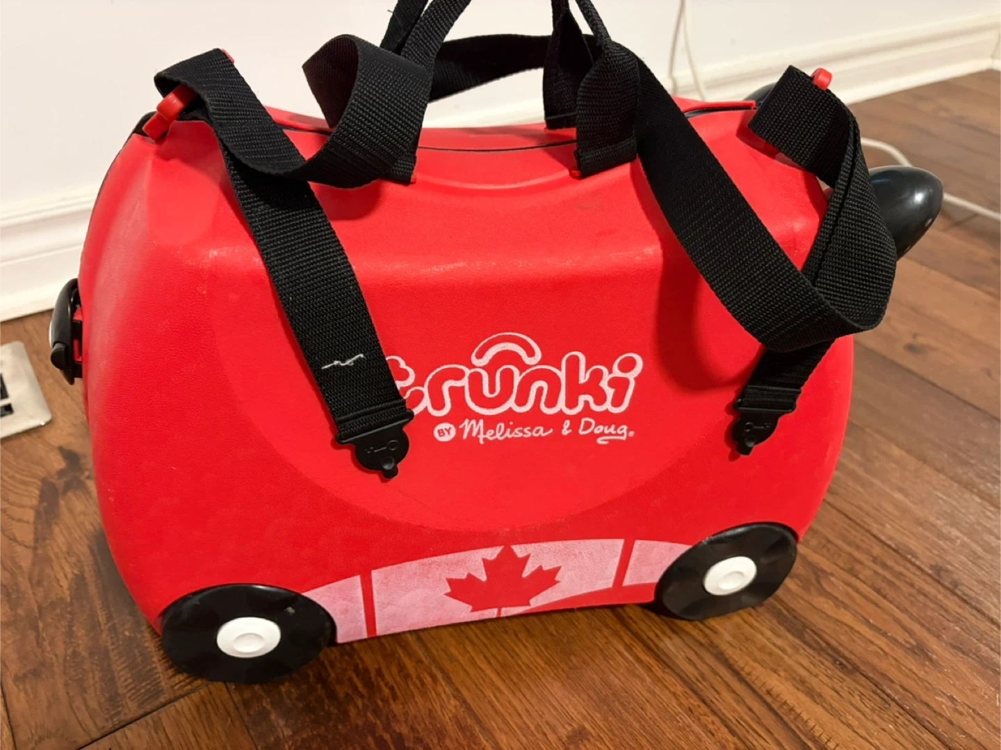Check out this red Trunki ride-on suitcase by Melissa & Doug! It's perfect for little travellers. The suitcase features a fun design and is in great condition for your next adventure