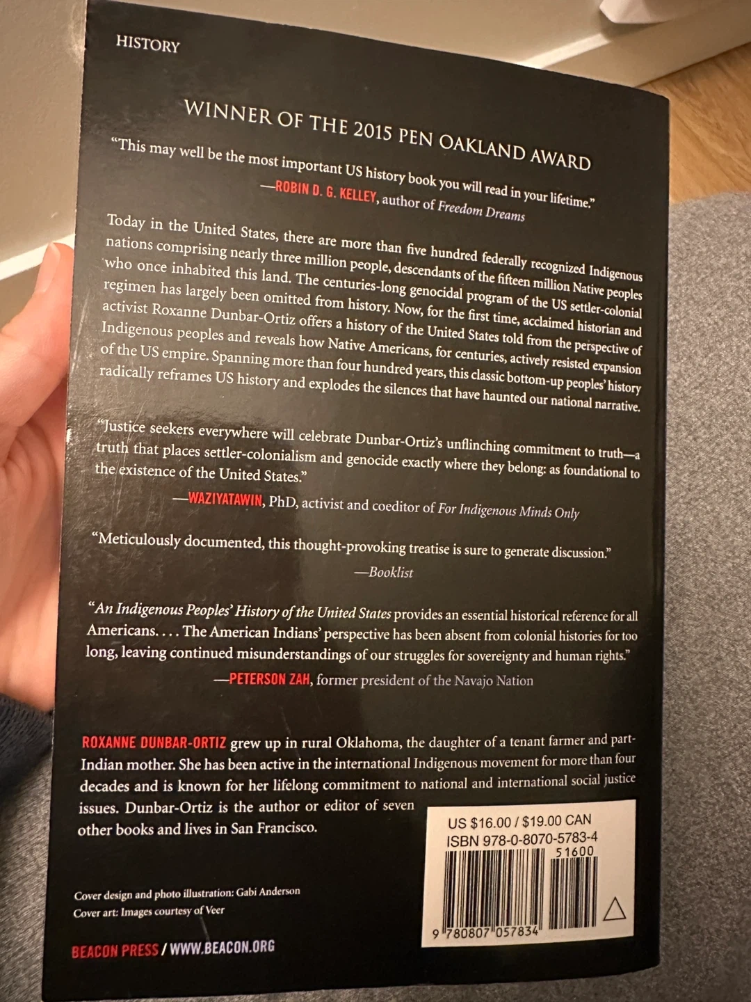Selling a copy of "An Indigenous Peoples' History of the United States" by Roxanne Dunbar-Ortiz. It won the 2015 American Book Award and is a great read for anyone interested in history