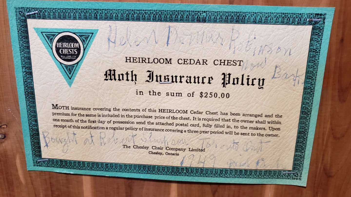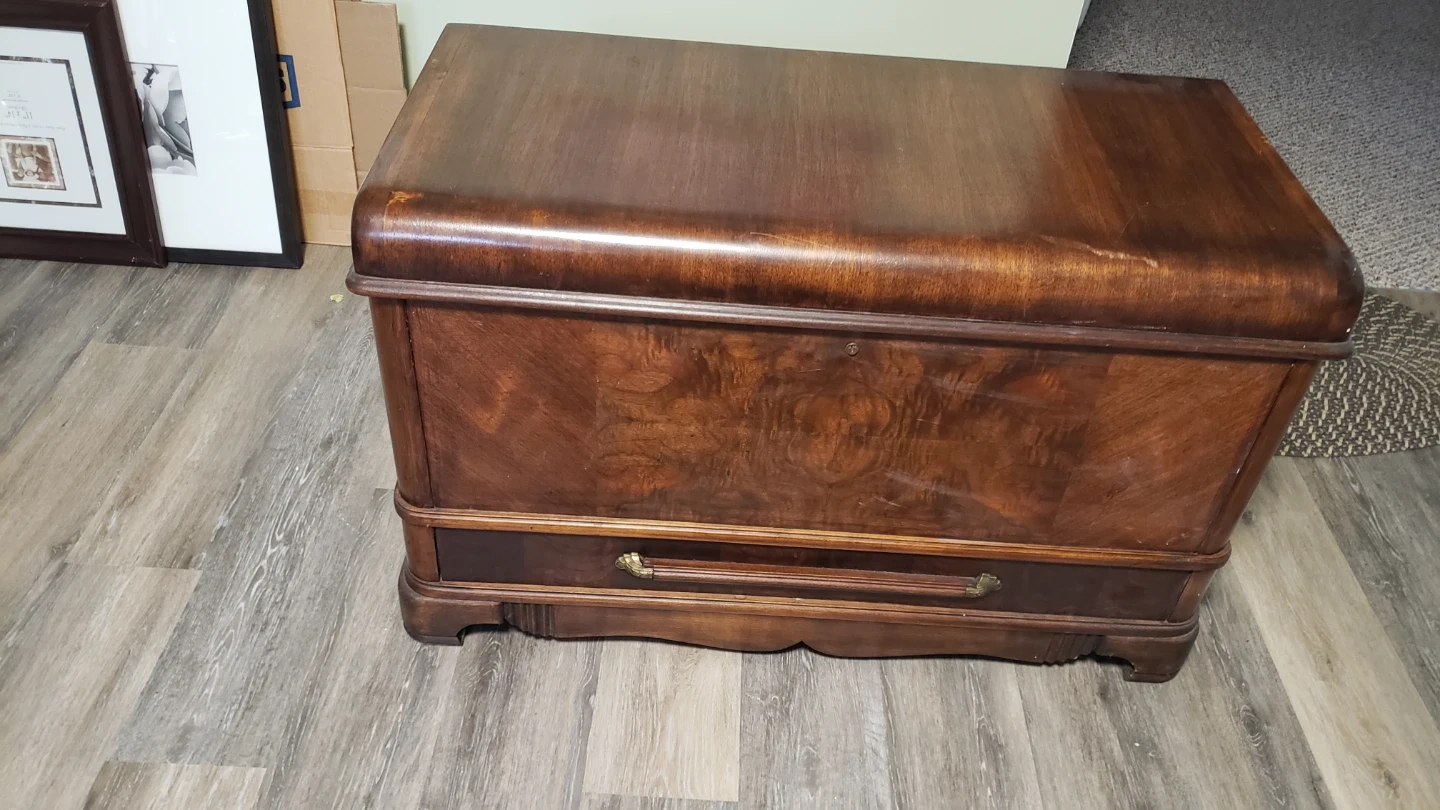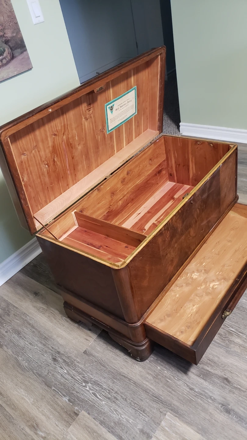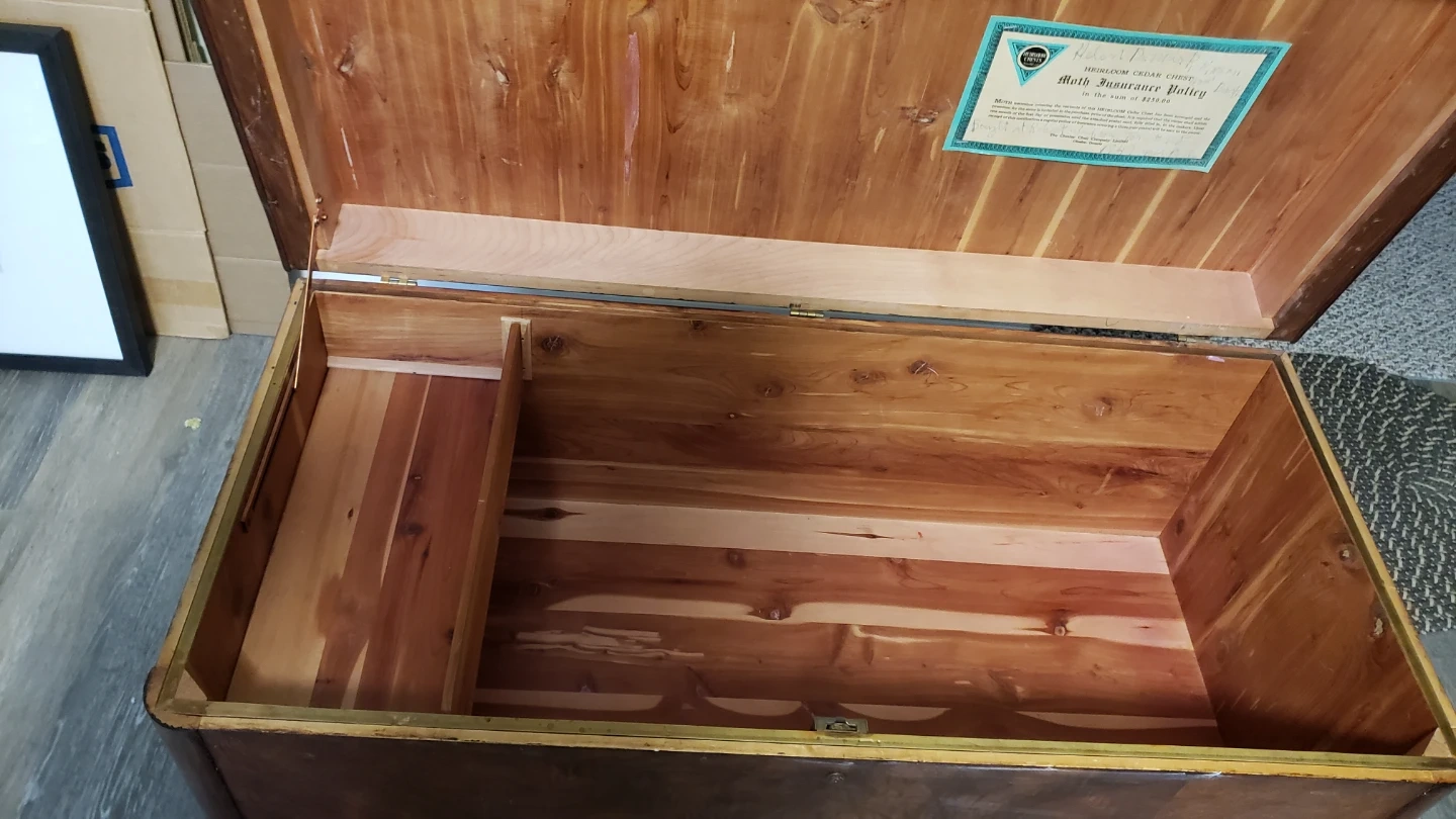 Selling an Heirloom Cedar Chest. It's a beautiful piece of furniture, perfect for storing blankets or other items. The chest is made of cedar, which helps to keep items fresh and protected from moths. It also features a moth insurance policy.