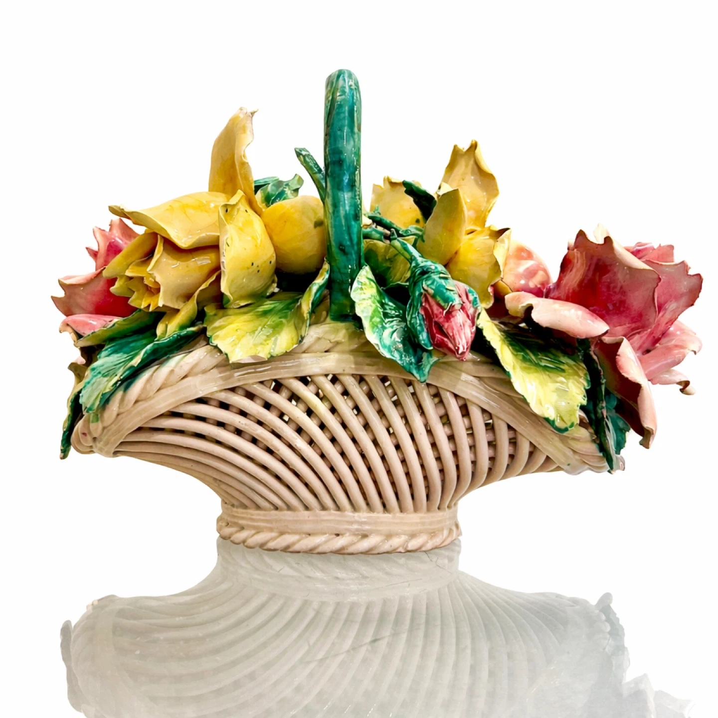 Highly decorative Italian porcelain floral basket featuring full-bloom pink and yellow roses with lush green leaves and a green-glazed handle. The modeling is dimensional and detailed, with a convincing basket-weave body and a dense floral arrangement suited for collector display (Italian decorative porcelain / Capodimonte-style tradition).