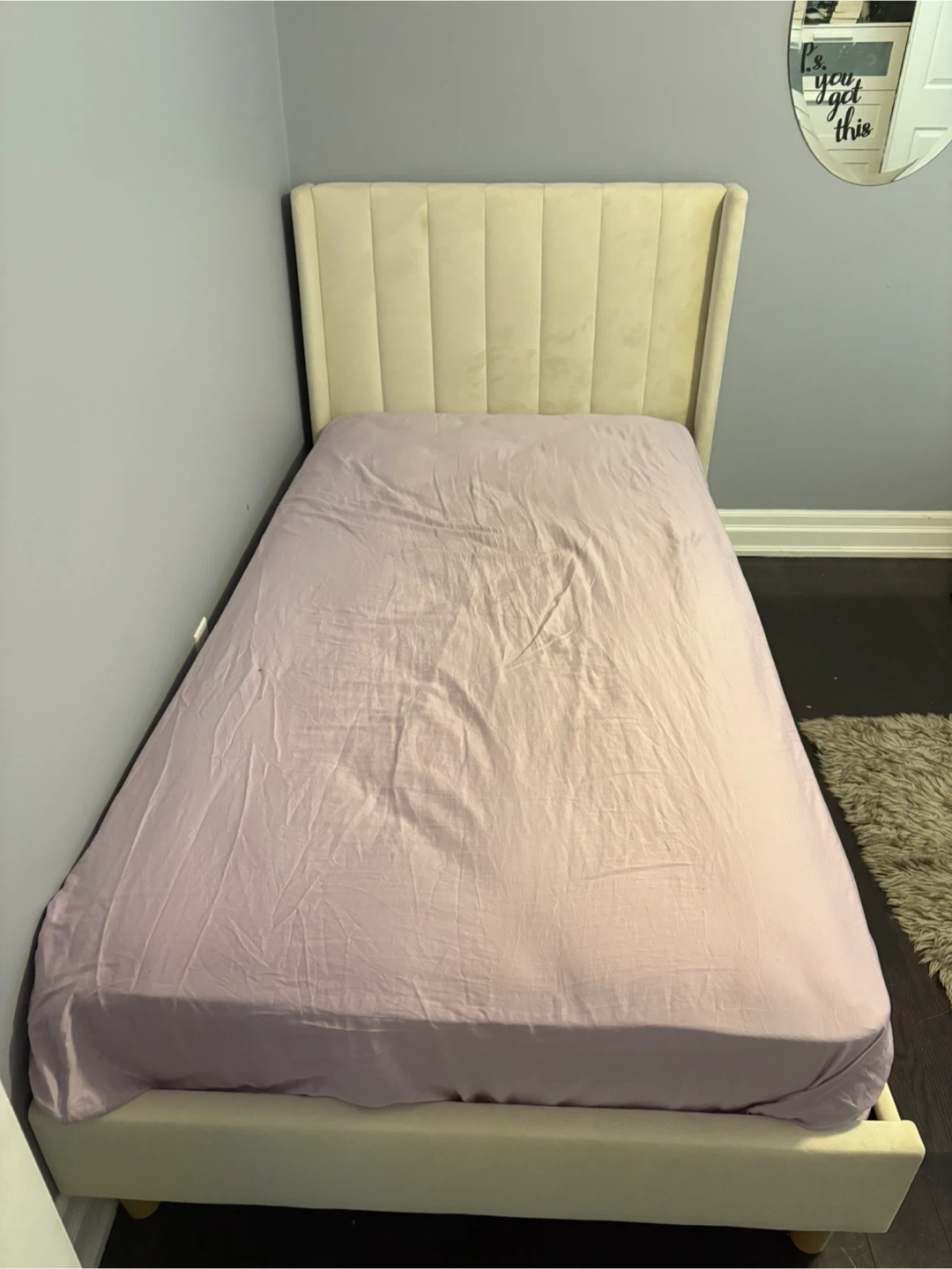 Selling a twin-size upholstered platform bed frame and mattress. It's in great shape and ready for a new home! The bed frame features a stylish upholstered headboard and a sturdy platform base. Perfect for a small bedroom or guest room. Only used part time for two years. Bought bedframe brand new for $300