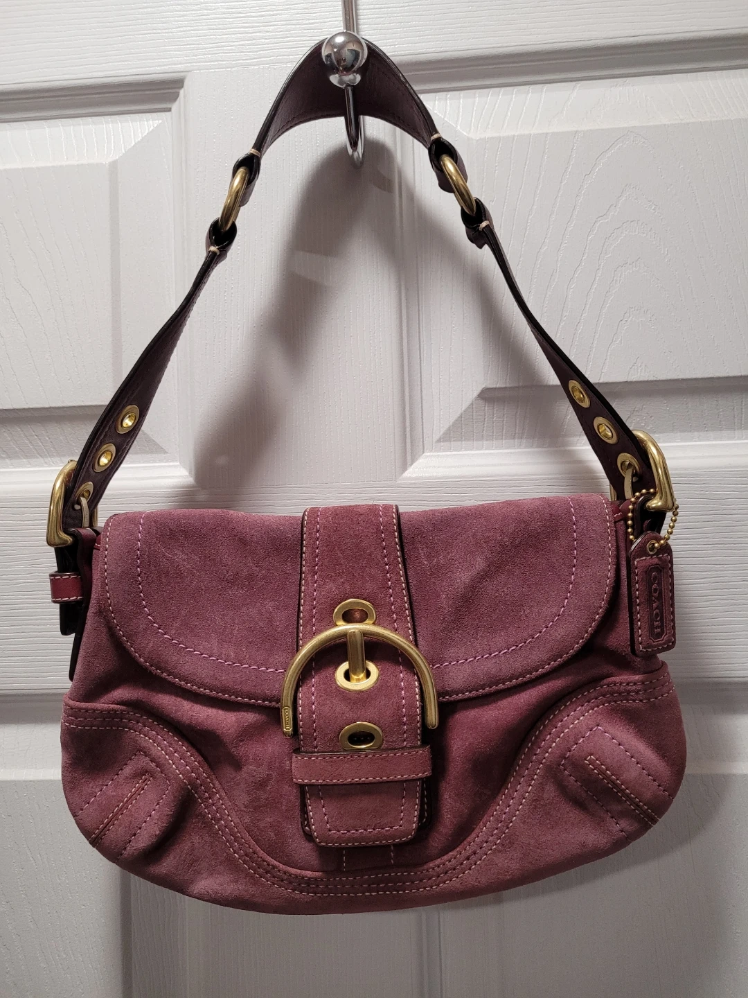 Selling a cute Coach shoulder bag! It's made of a lovely suede leather in a unique mauve colour with gold hardware. Perfect for adding a pop of colour to your outfit!