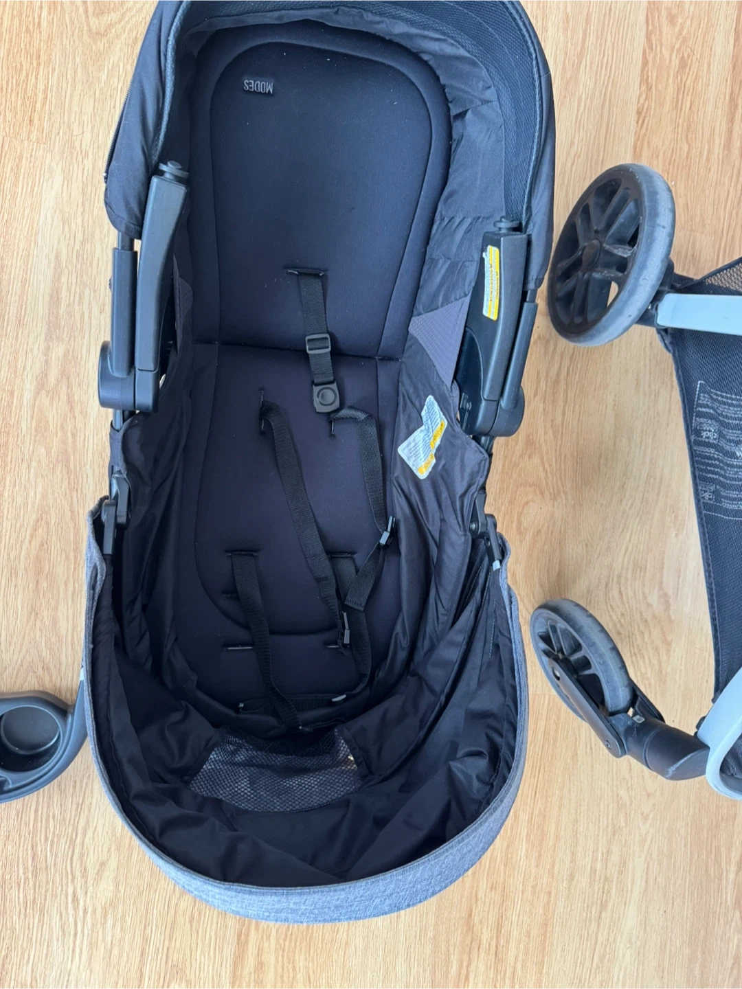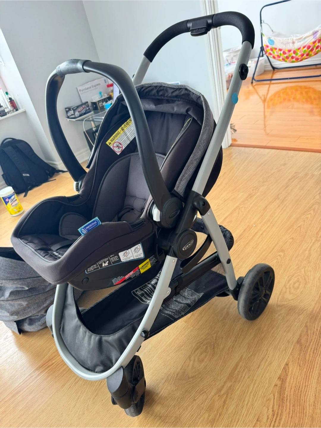 Car seat clicks easily into stroller (travel system)