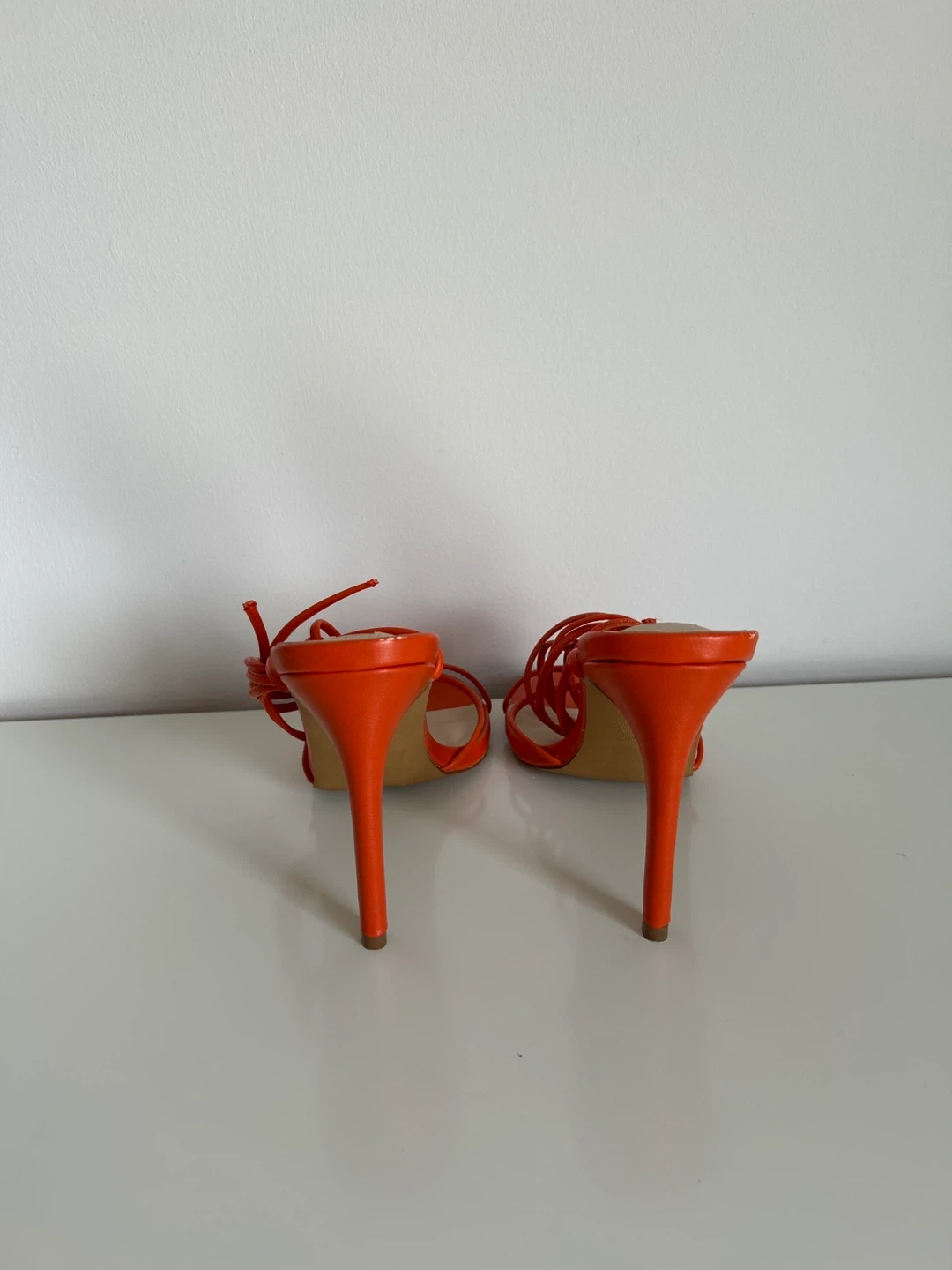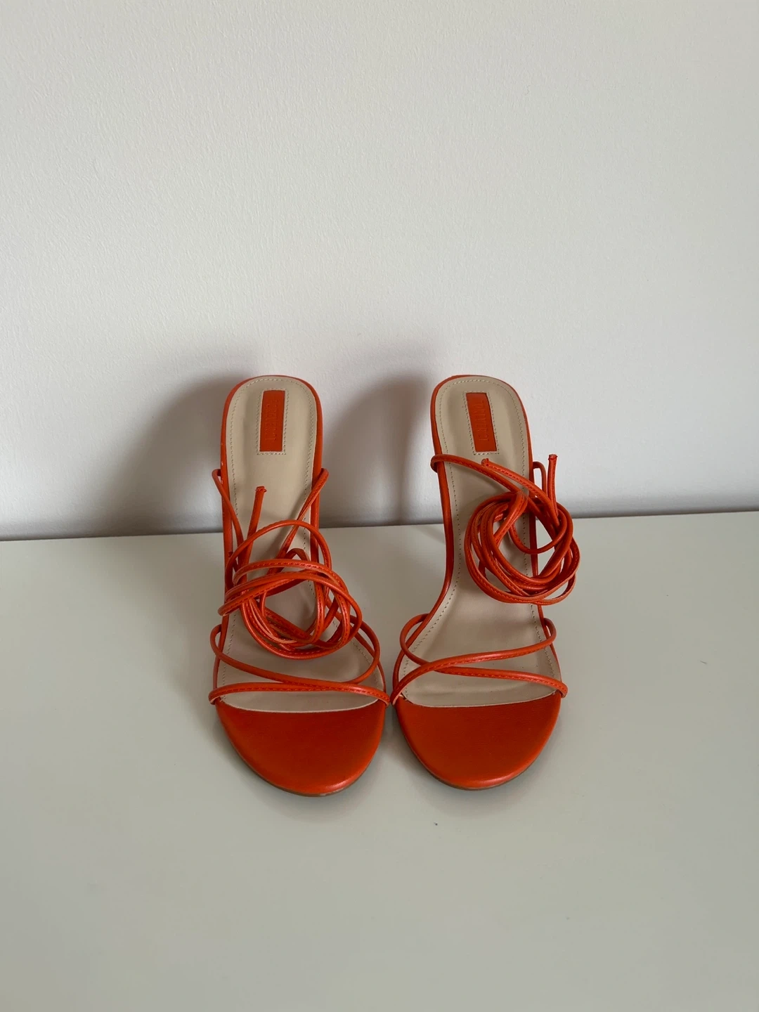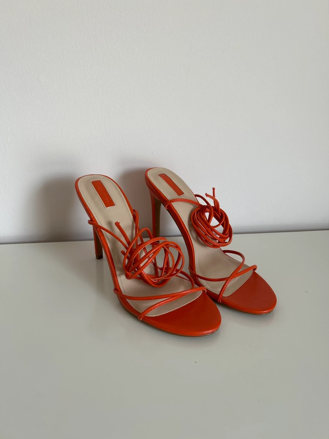 These are a pair of vibrant orange lace-up heels from Forever 21. They're perfect for adding a pop of colour to any outfit. The shoes feature a stylish strappy design that wraps around the ankle, offering a chic and trendy look. These heels are in great condition and ready for a new home!