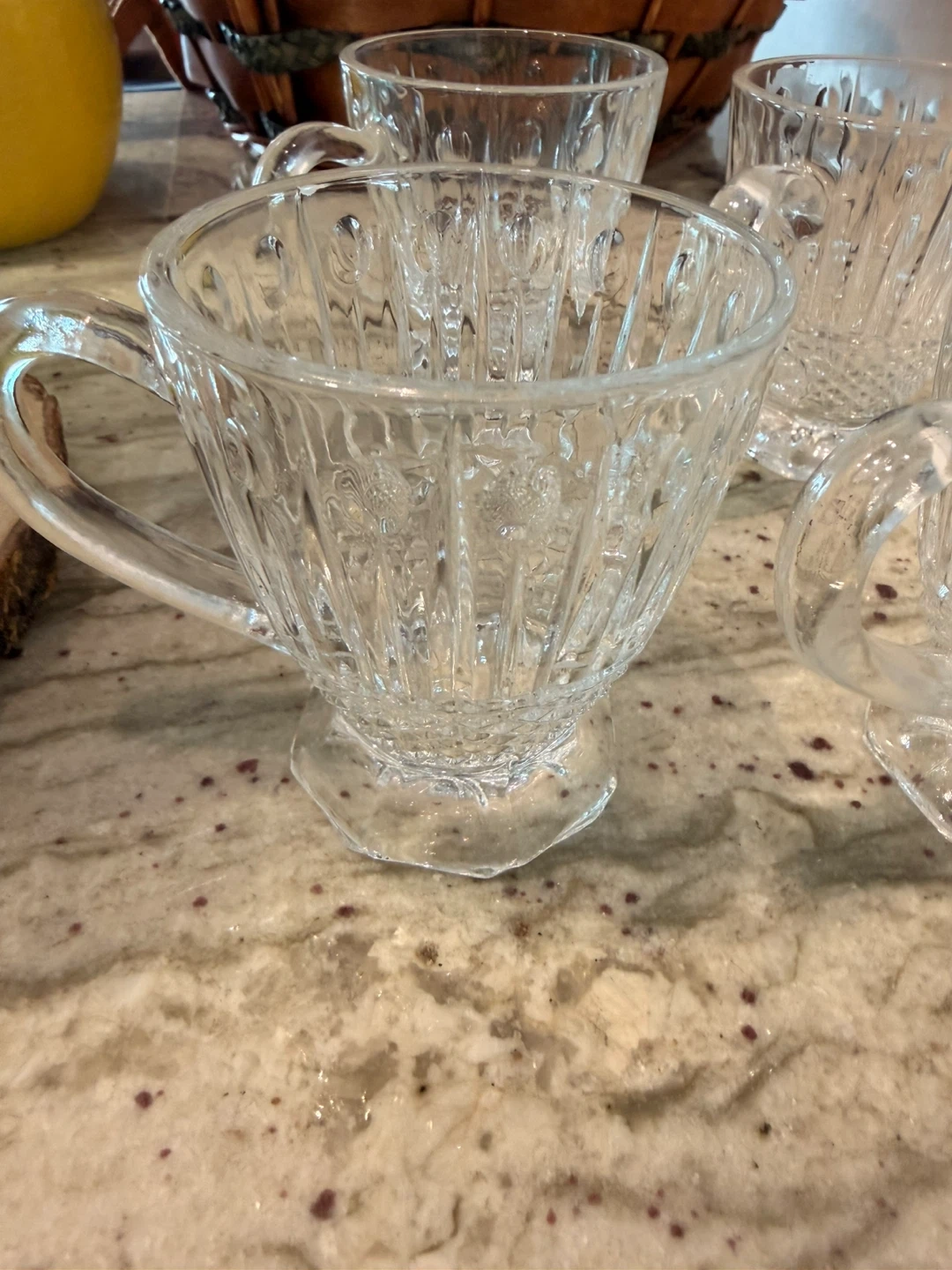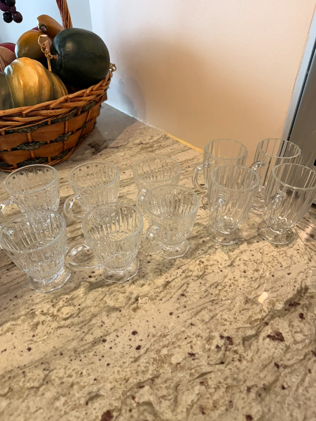 Selling a set of 10 clear glass tea cups. They have a lovely textured design and are perfect for tea or coffee. Great condition!
