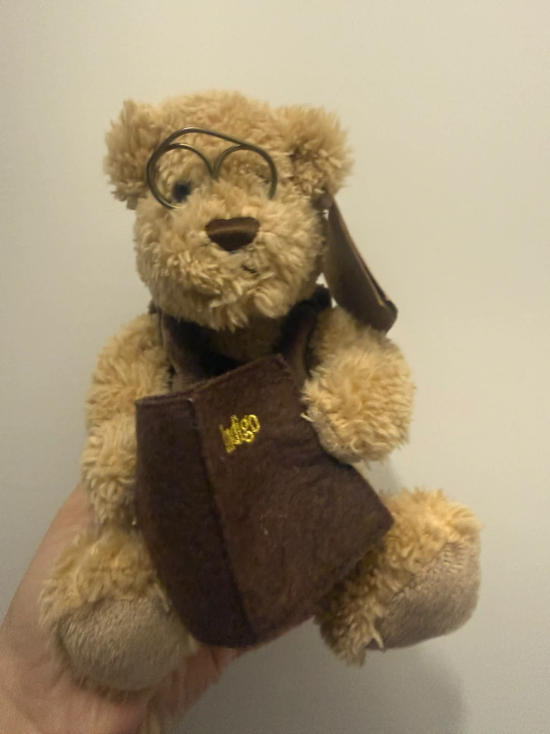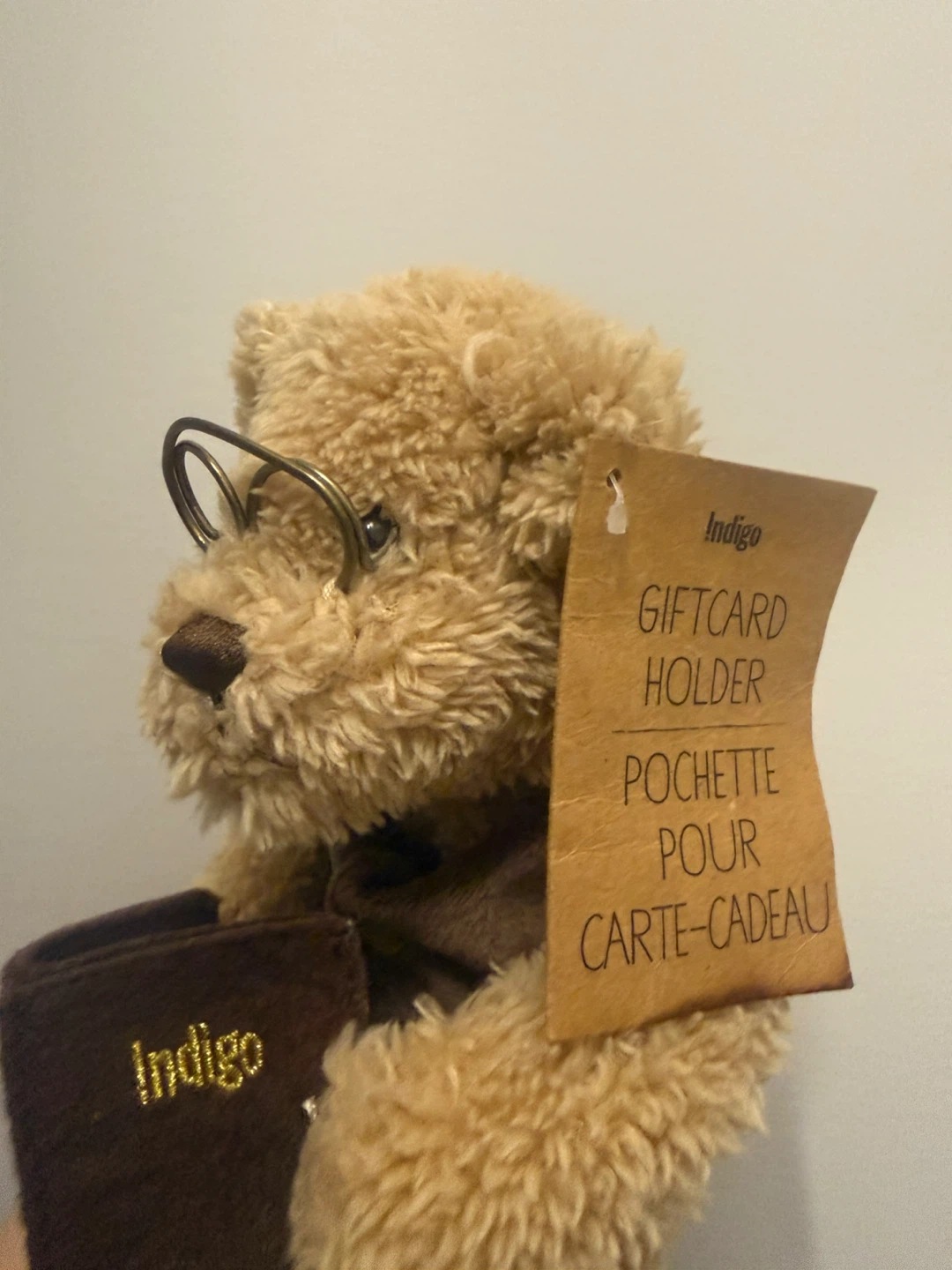 Selling a cute Indigo teddy bear that doubles as a giftcard holder! It's in great condition and ready for a new home. The teddy bear is wearing glasses and holding a brown giftcard holder with the Indigo logo on it