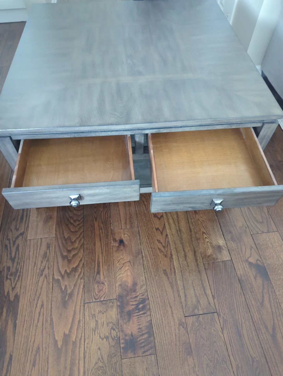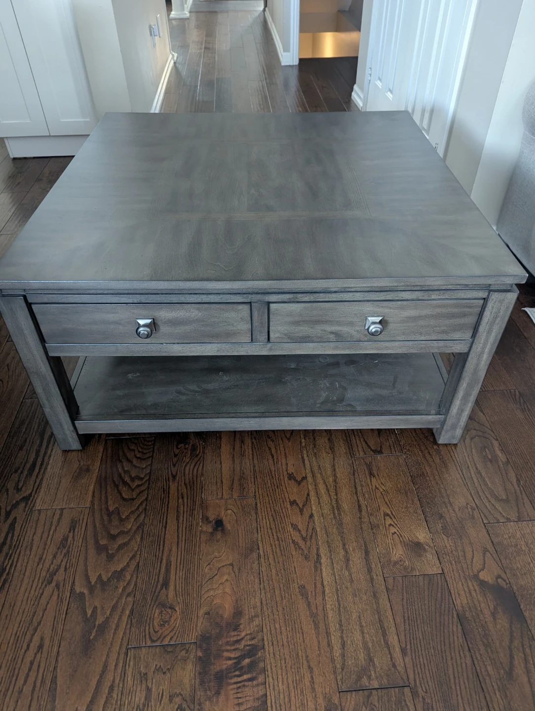 Here's a lovely square 40inch solid grey wood coffee table that would look great in any living room! It comes with four drawers for extra storage and a shelf underneath for books or decor. It's in good condition and ready for a new home!