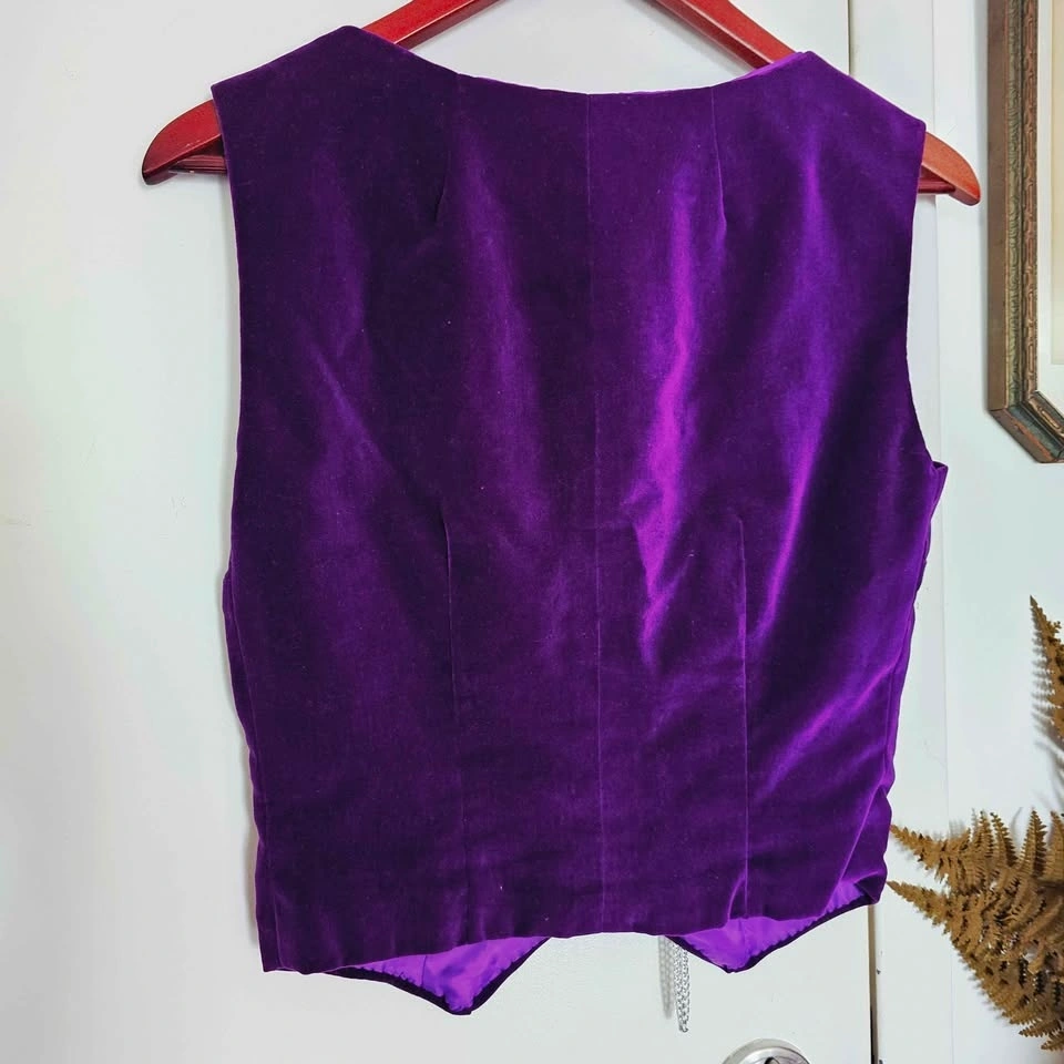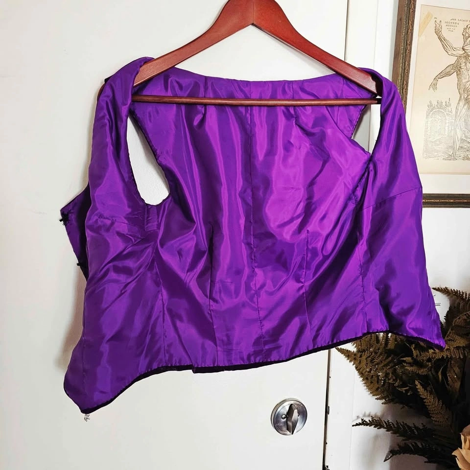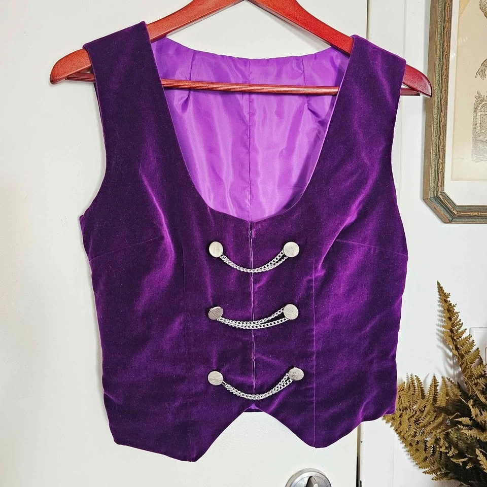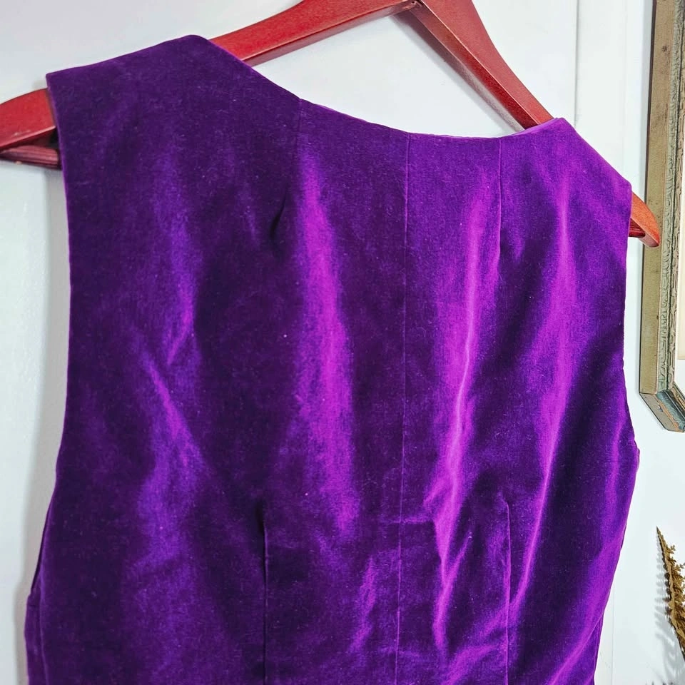 Amazing handmade and one of a kind jewel tone purple velvet tailored vest, from the late 60s or early 70s. Vest has a structured and cropped cut, perfect for layering with a flowy blouse and jeans, over a witchy dress, or worn on its own as a crop top. Romantic Victorian inspired glam rock bohemian vibes for days!