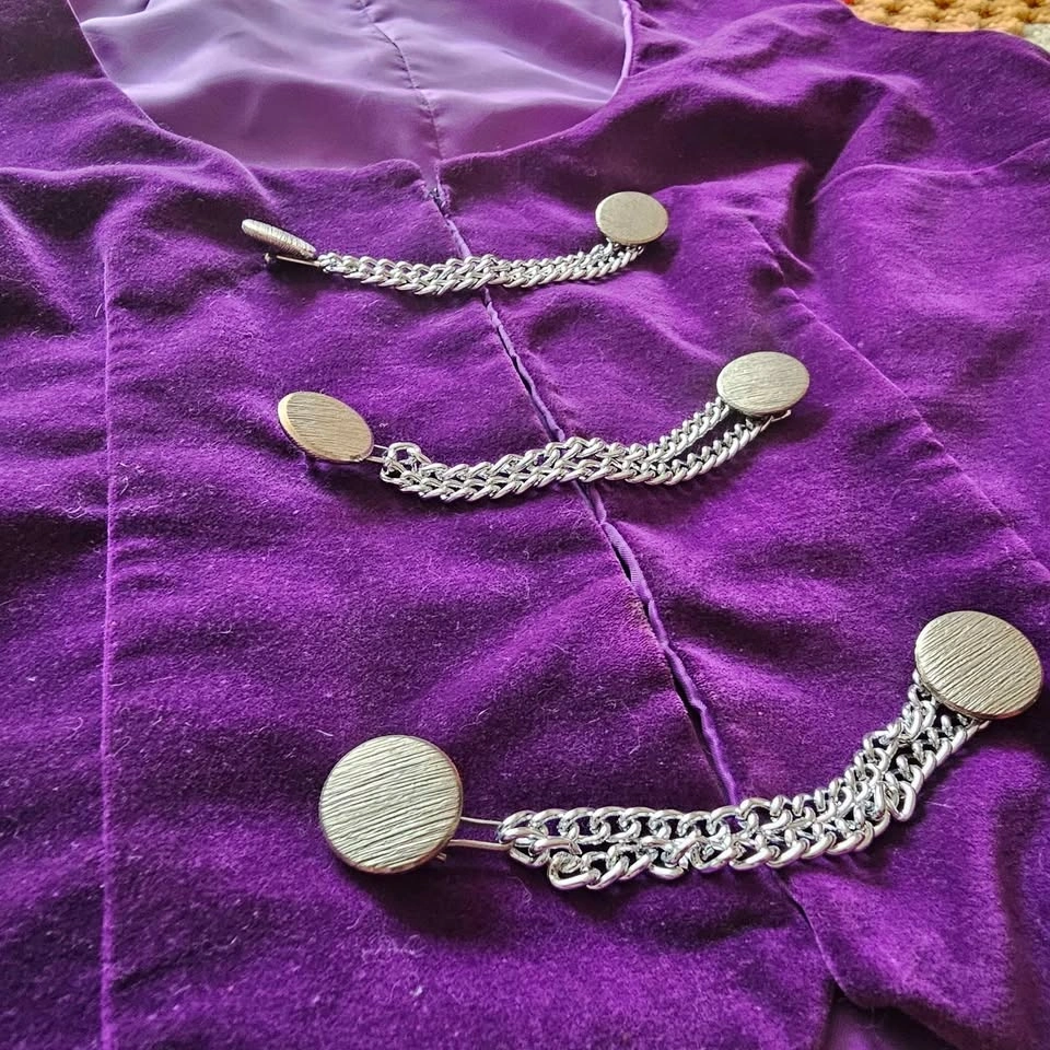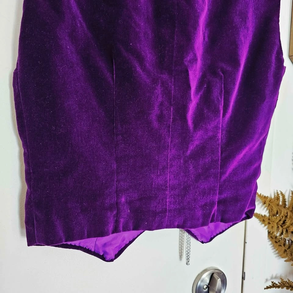 Fabric is a high quality electric purple short pile velvet, and vest closes with hidden hooks and eyes. There are textured silver tone buttons and removable chain frog closure accents. Vest is fully lined with a purple poly lining. It has a tailored waistcoat silhouette.