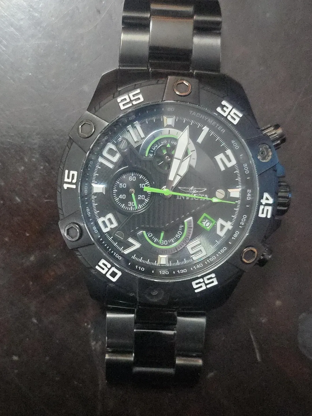 Selling a stylish Invicta chronograph watch in black. It has a tachymeter and chronograph subdials. The watch features a bold design with clear markers and a sturdy build. Perfect for everyday wear! NO BATTERY