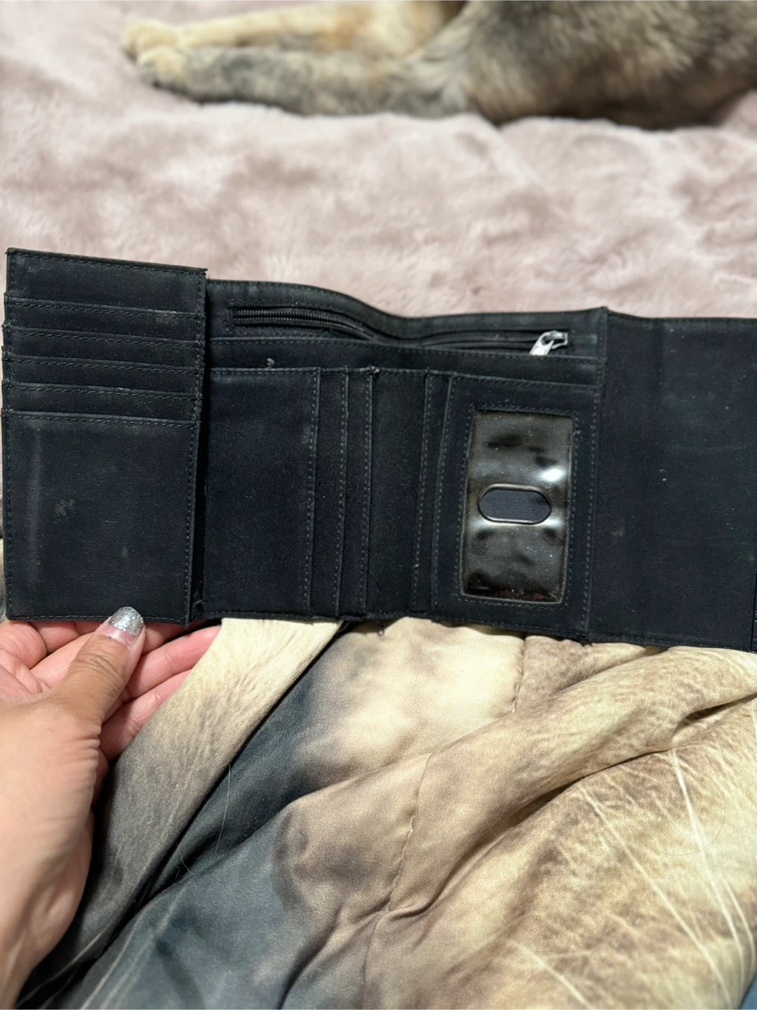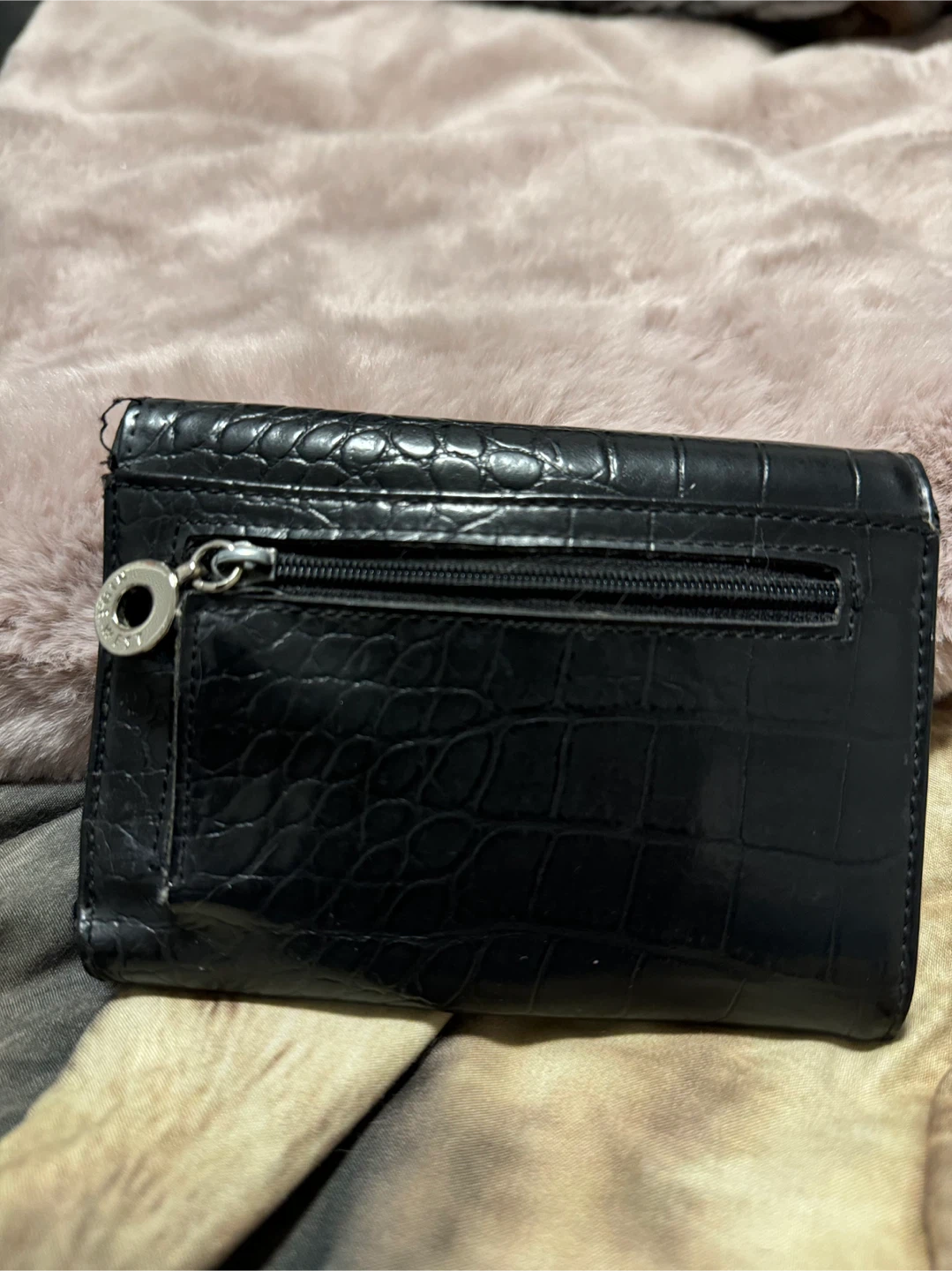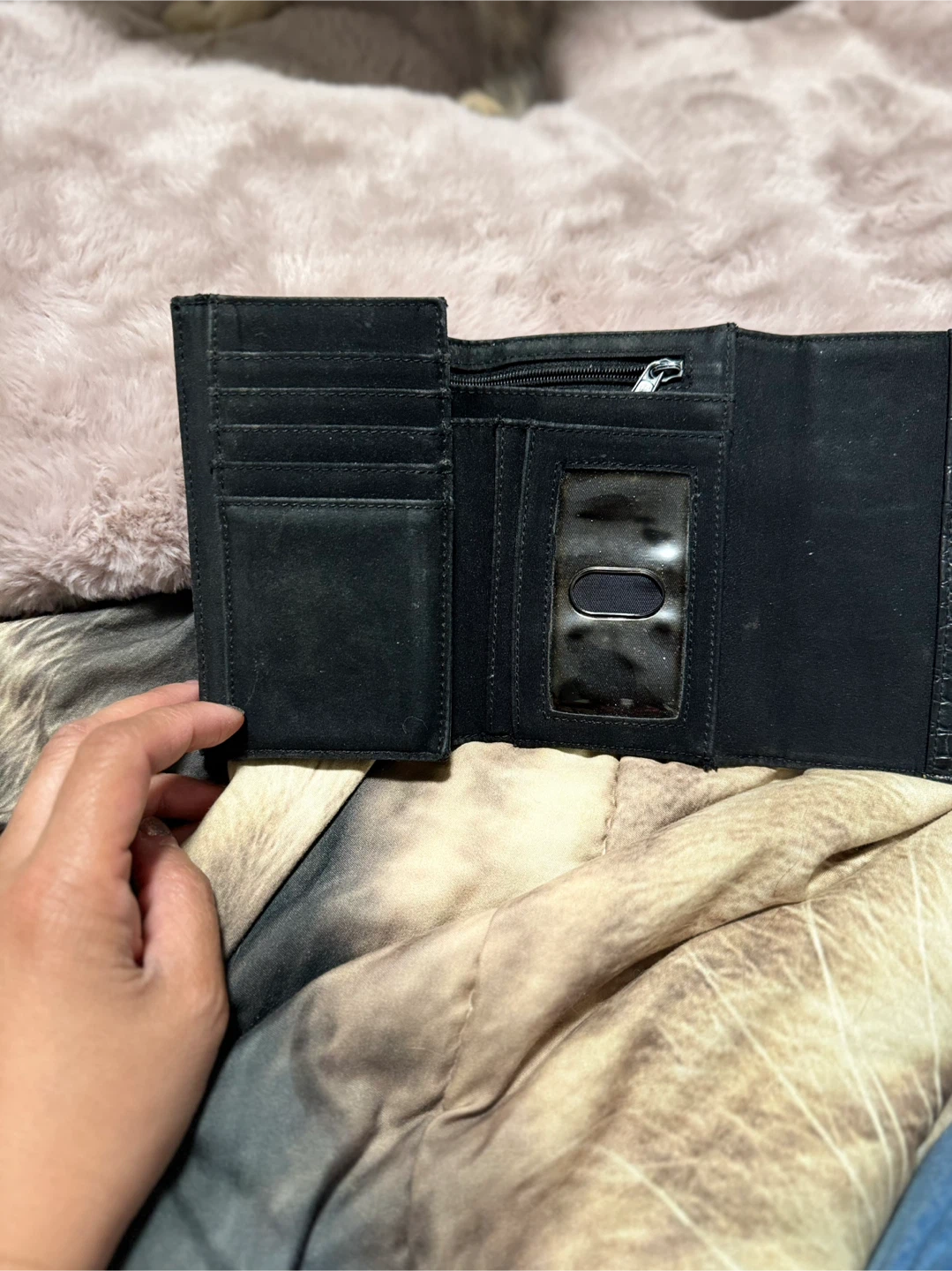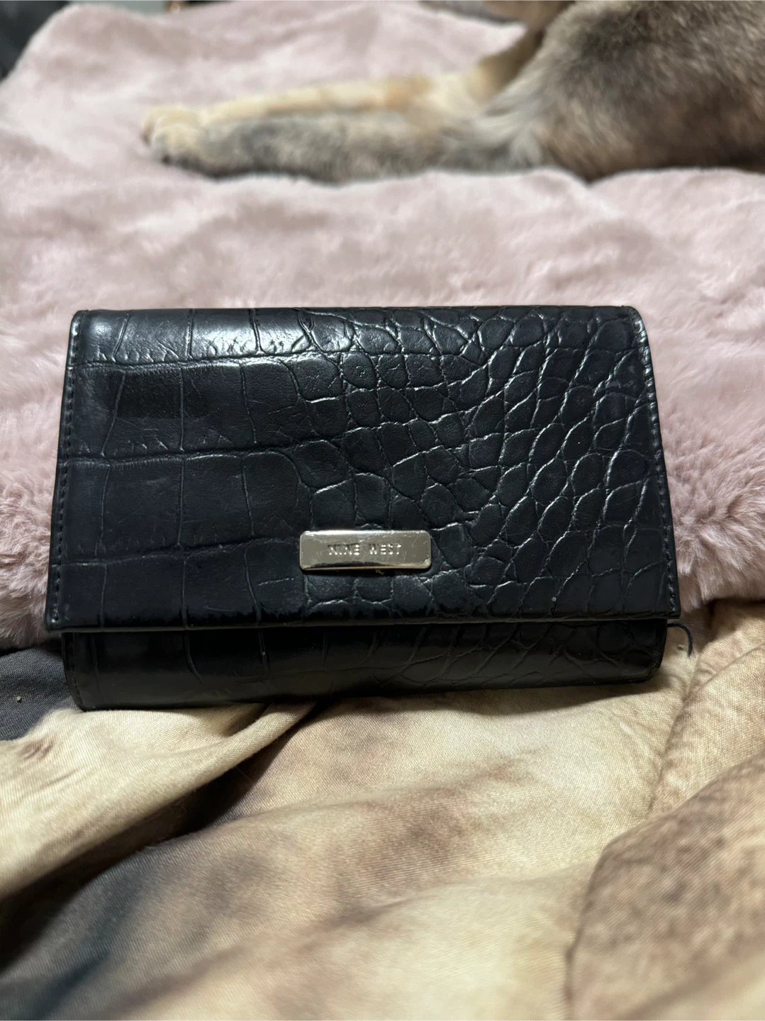 Selling a Nine West black trifold wallet. It has a faux crocodile skin texture and a zippered compartment for change. Great for everyday use!