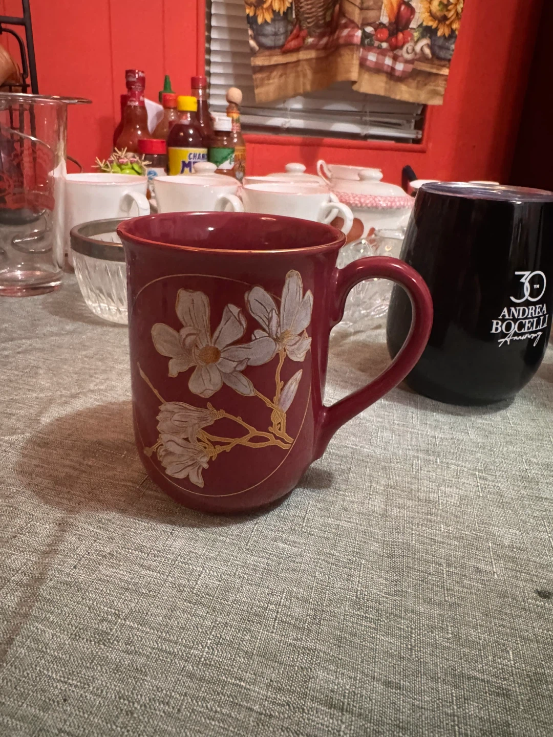 A maroon coffee mug with a floral design. Perfect for your morning coffee or tea