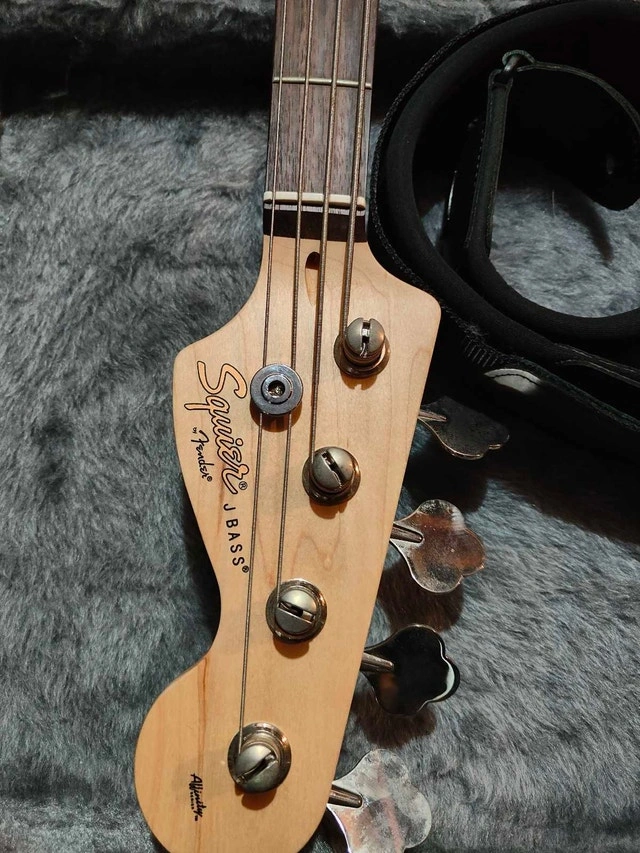 For sale is a used Squier by Fender Jazz Bass, complete with a hard case. This bass guitar is perfect for anyone looking to get that classic Jazz Bass sound on a budget. It has a smooth neck and responsive pickups, making it a joy to play. There are some signs of wear, which I have captured in the photos, but it functions perfectly and has been well-maintained. Geddy Lee Design.