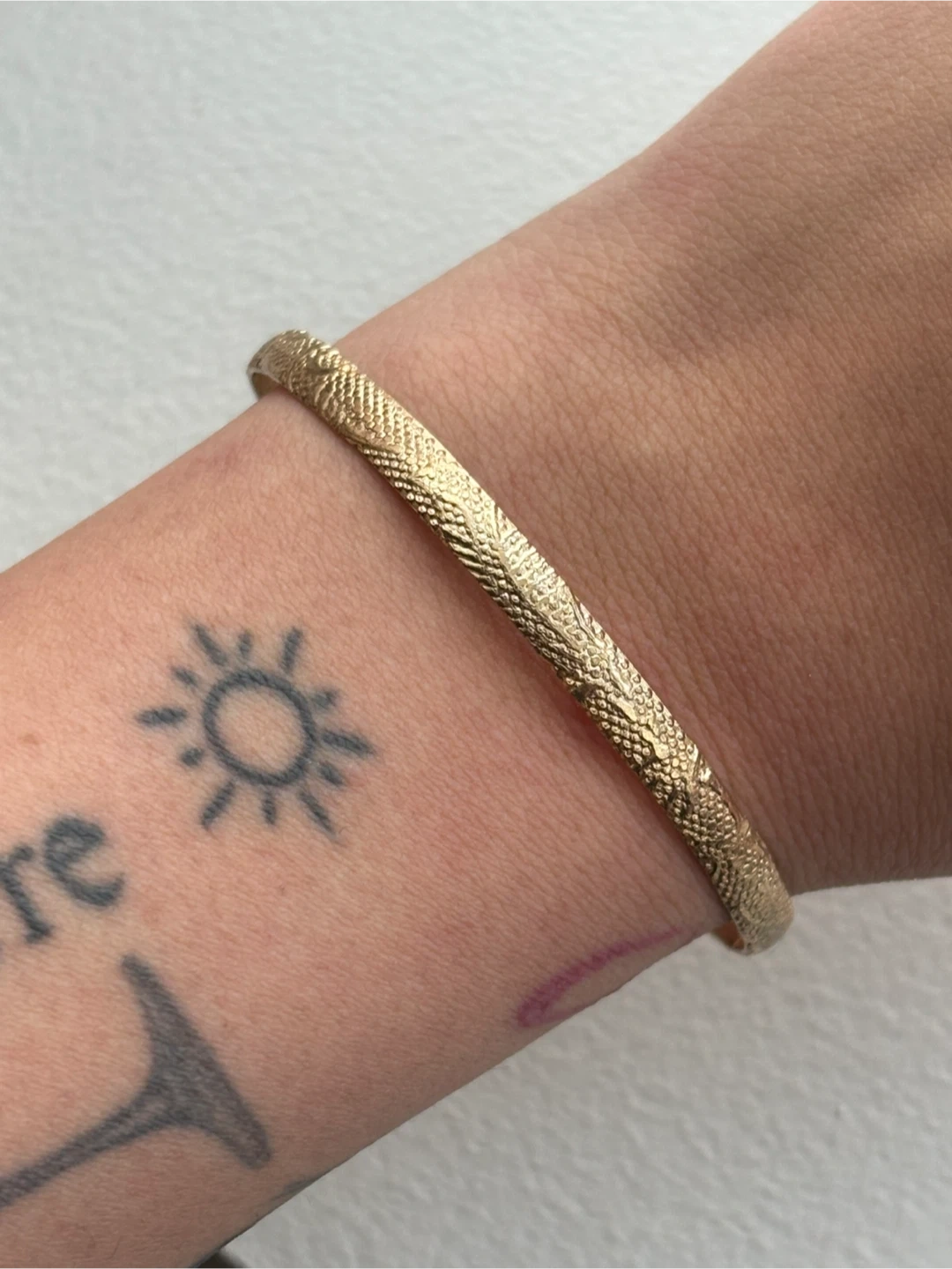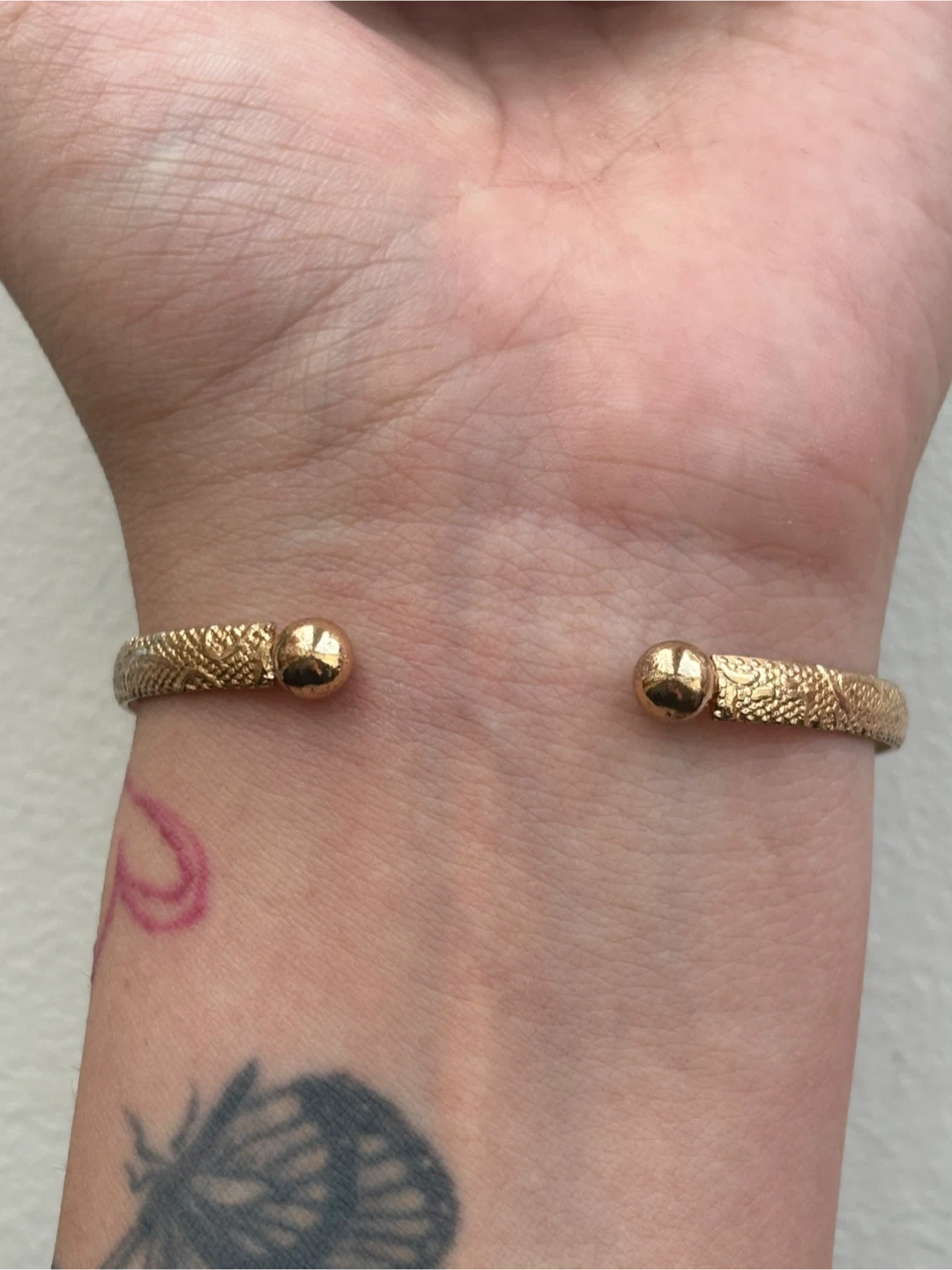 Selling a gold-tone bangle bracelet. It has a textured design and ball ends. Perfect for adding a touch of elegance to any outfit