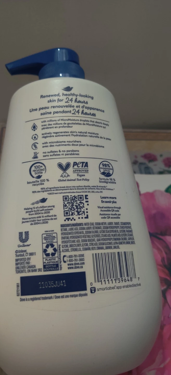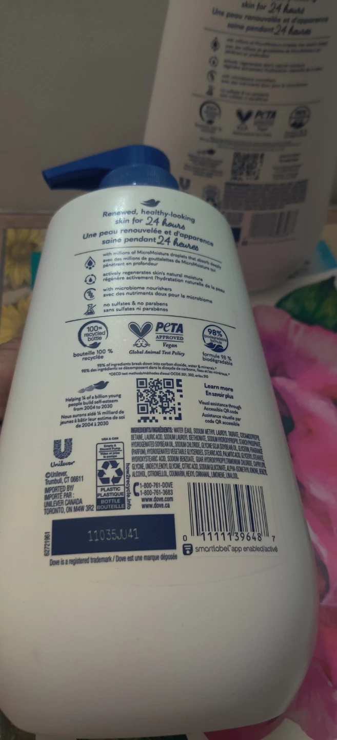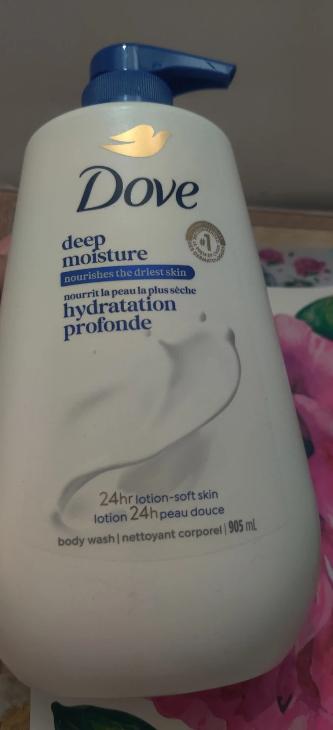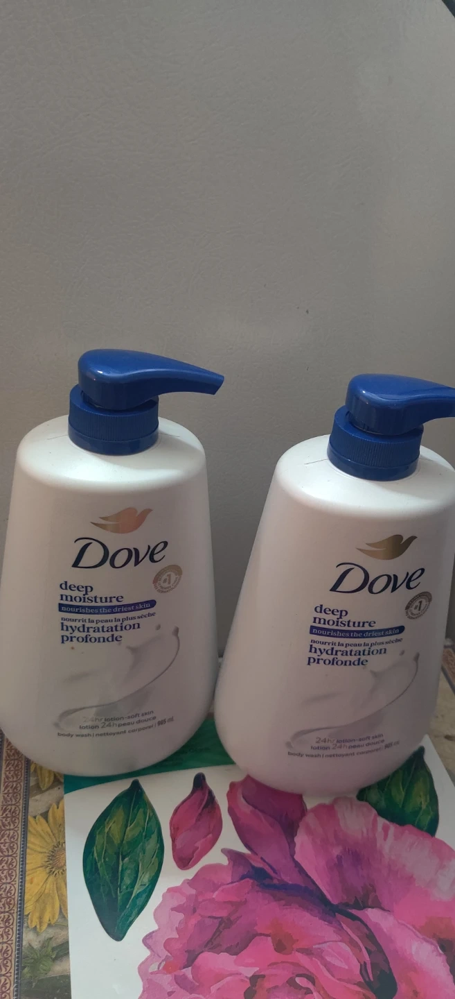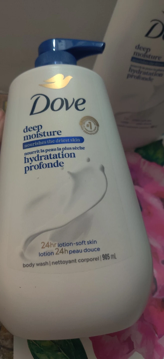 Dove Deep Moisture Body Wash nourishes the driest skin. It provides 24-hour lotion-soft skin and is a body wash and nettoyant corporel. The bottle is 100% recycled.Selling 2 bottles