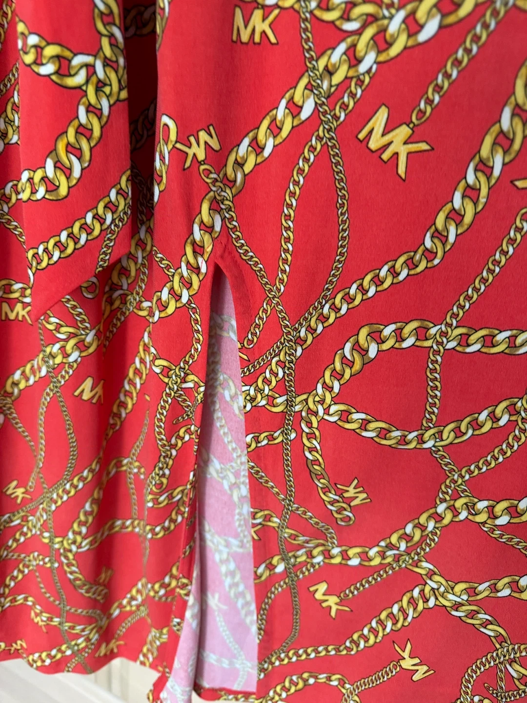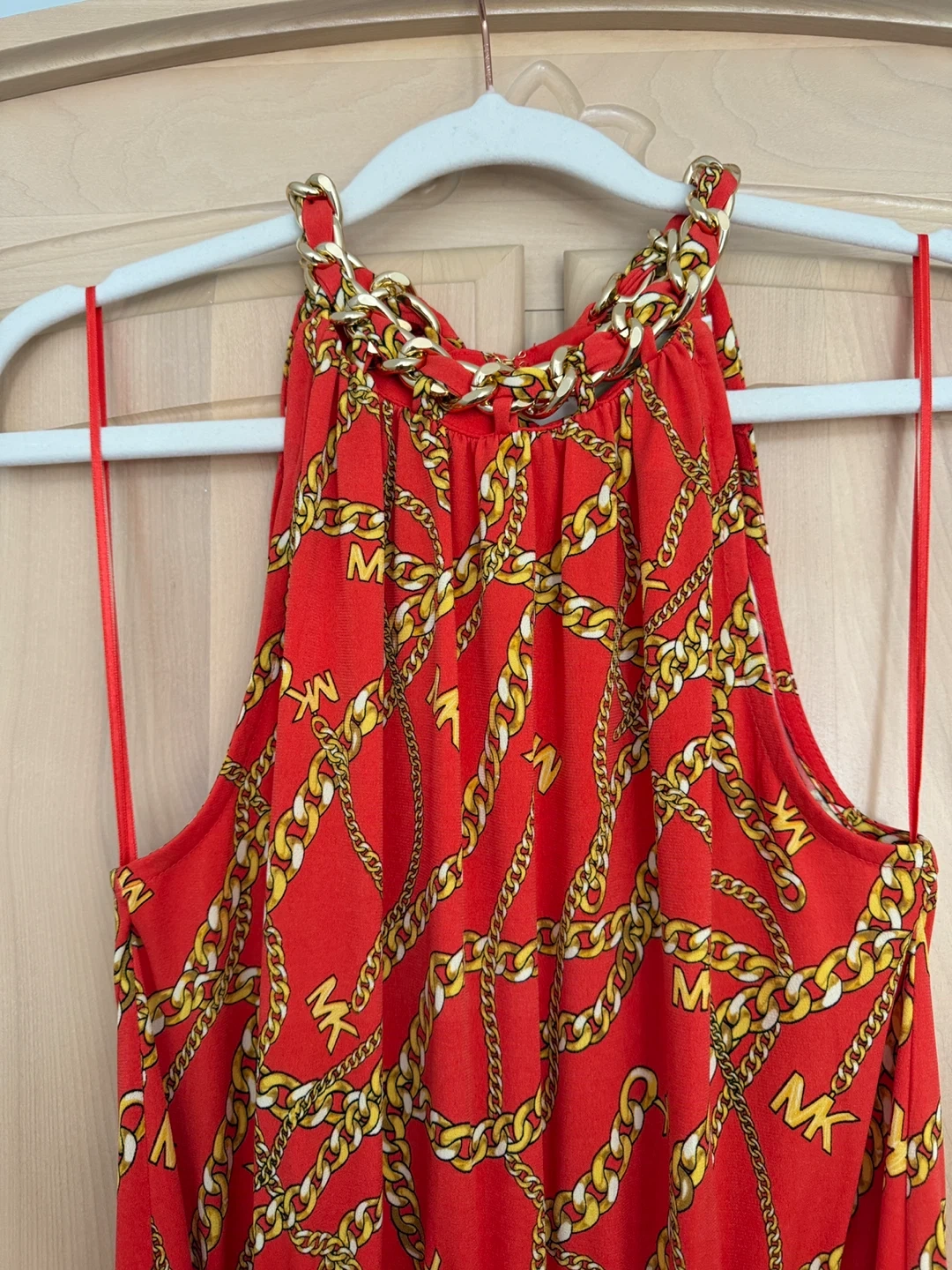 This Michael Kors dress features a vibrant red colour with a unique chain print. It's a halter style dress and is a size M. Perfect for a night out or a special occasion!
