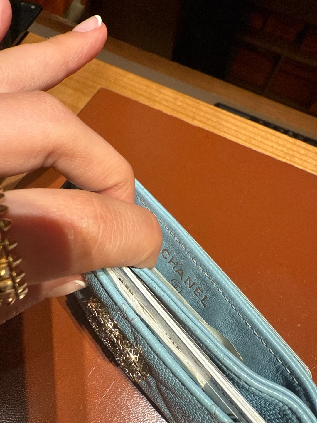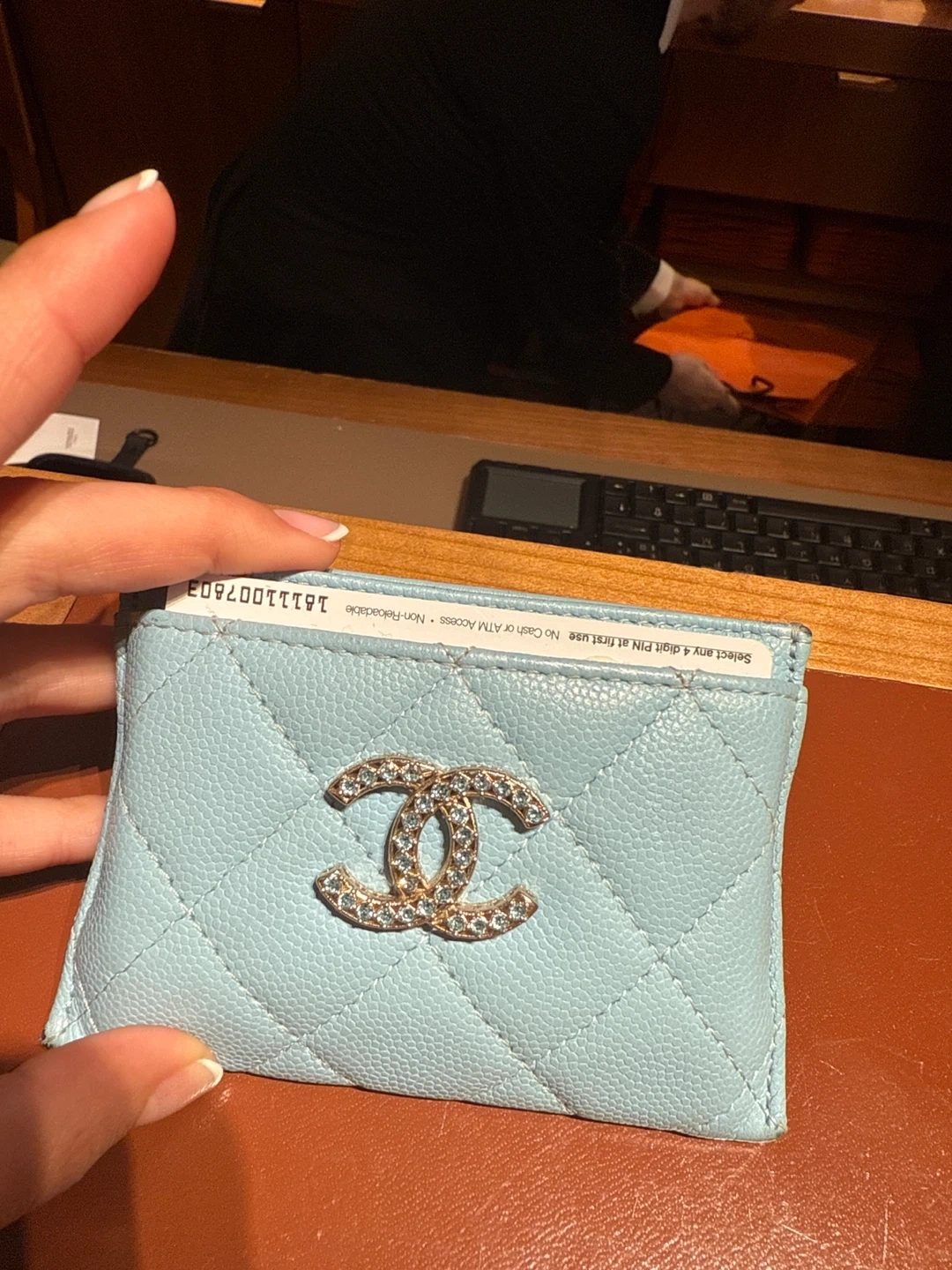 Selling a beautiful Chanel card holder in a light blue color. It features the iconic Chanel logo. Perfect for keeping your cards organized in style!