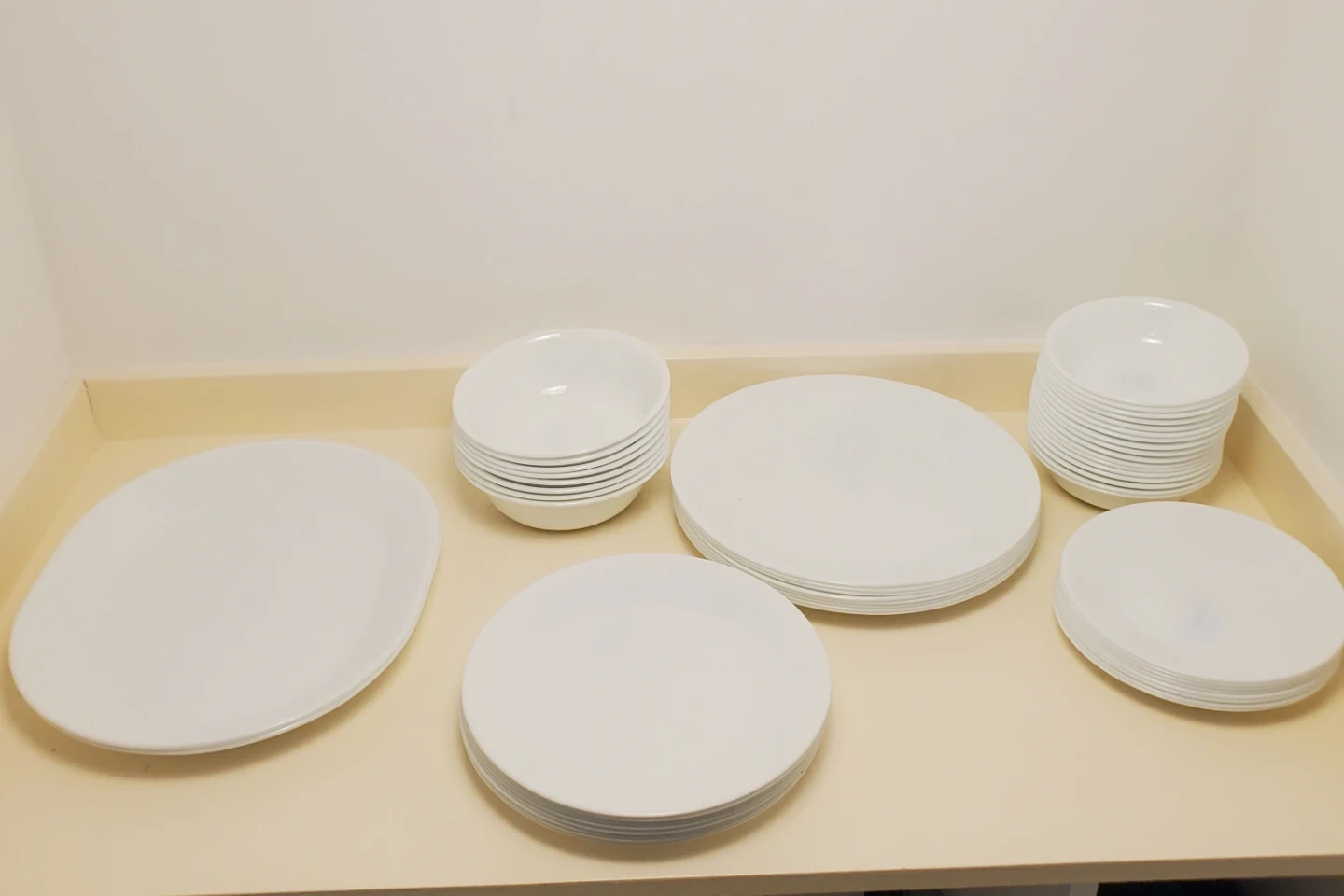 Selling a set of Corelle dinnerware in white. Includes 3 different sized plates and 2 different sized bowls. 2 food platter plates.They have wear around the rim and scratches from Silverware. 1 of the small bowls has a small gouge on the side. In over all really good condition. 50 pieces in total. Located northside by londonderry mall.