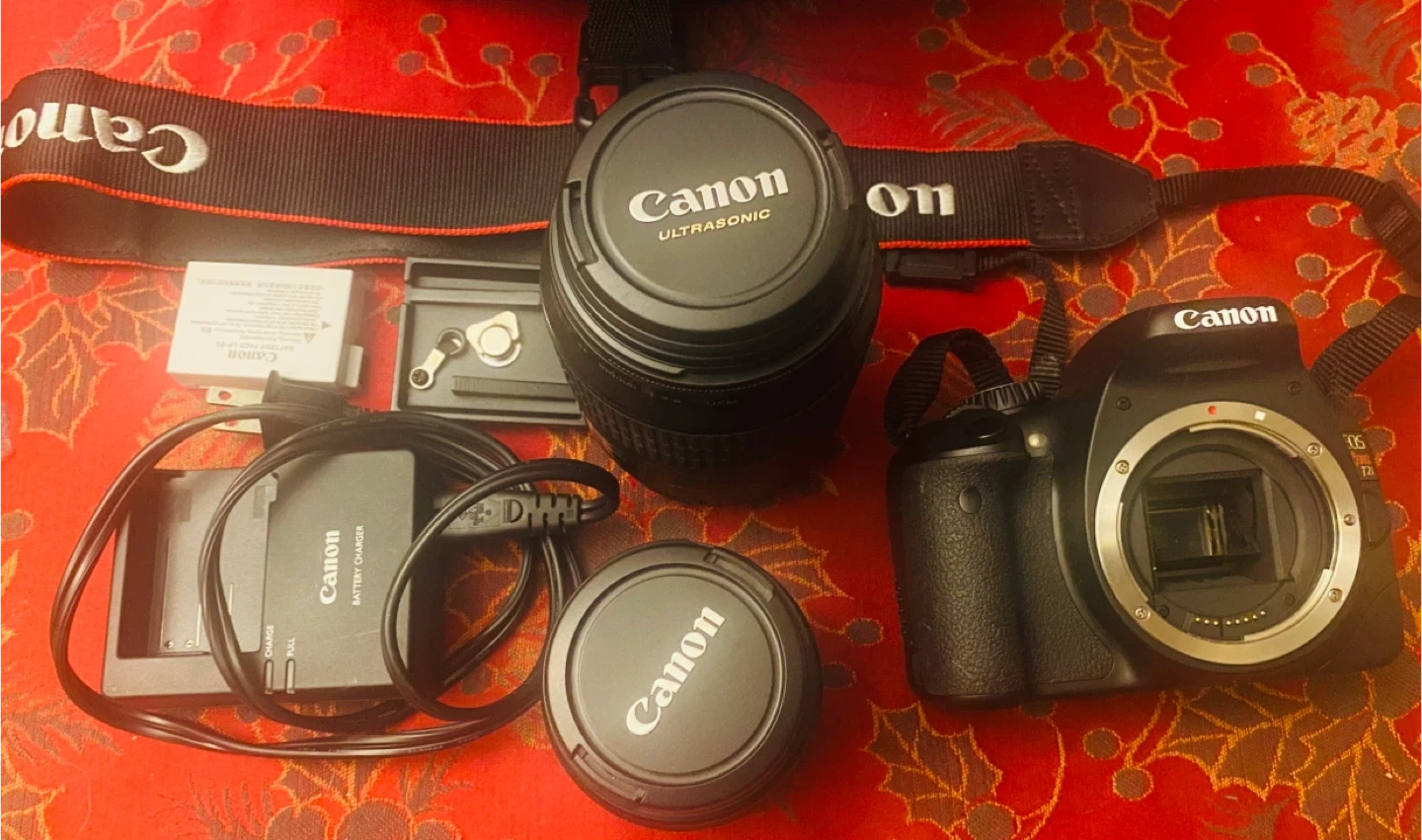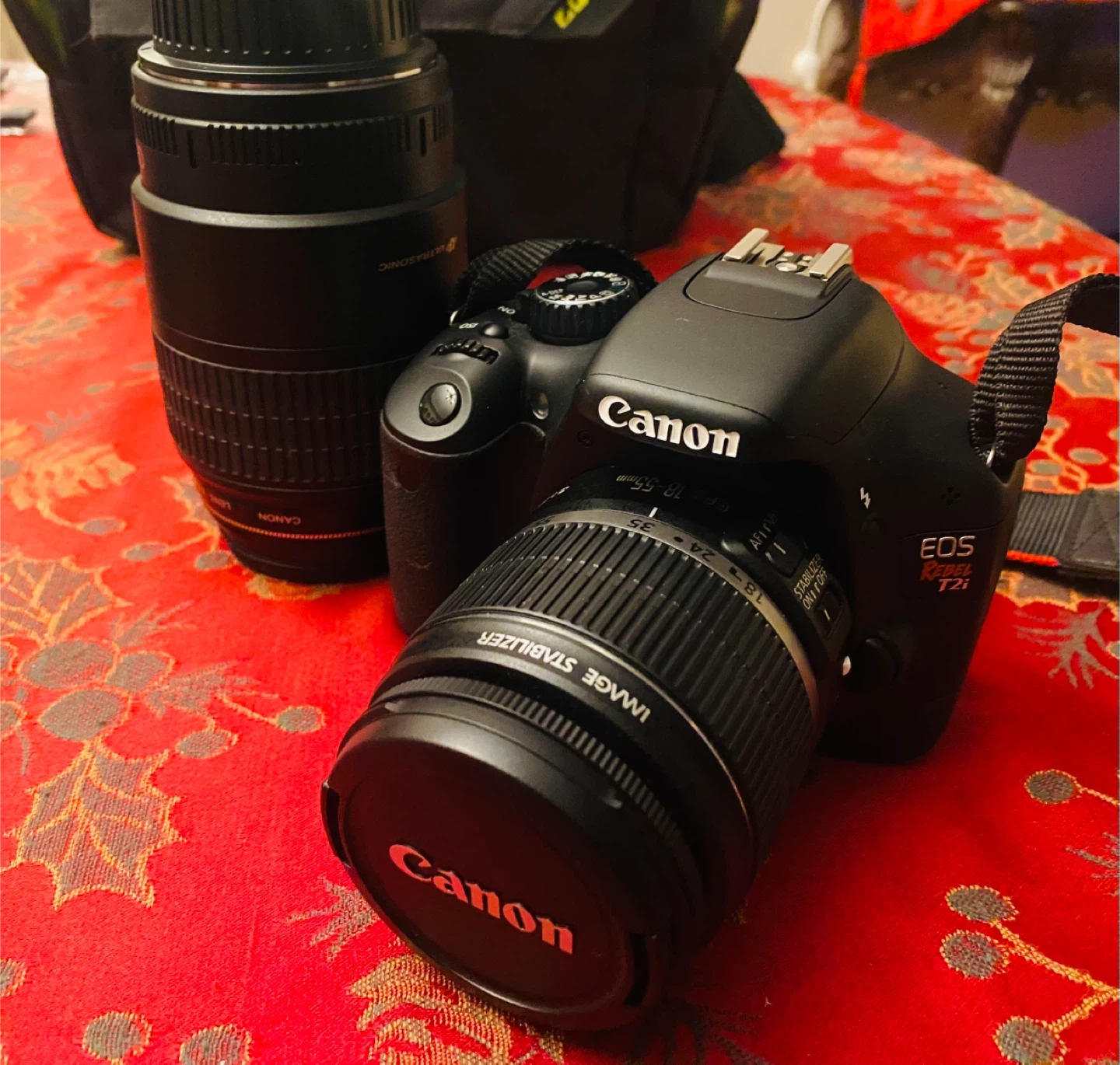 Selling a Canon EOS Rebel T2i DSLR camera. It comes with a couple of lenses and a battery charger, tripod, and holder. Great for someone looking to get into photography! Barely used.