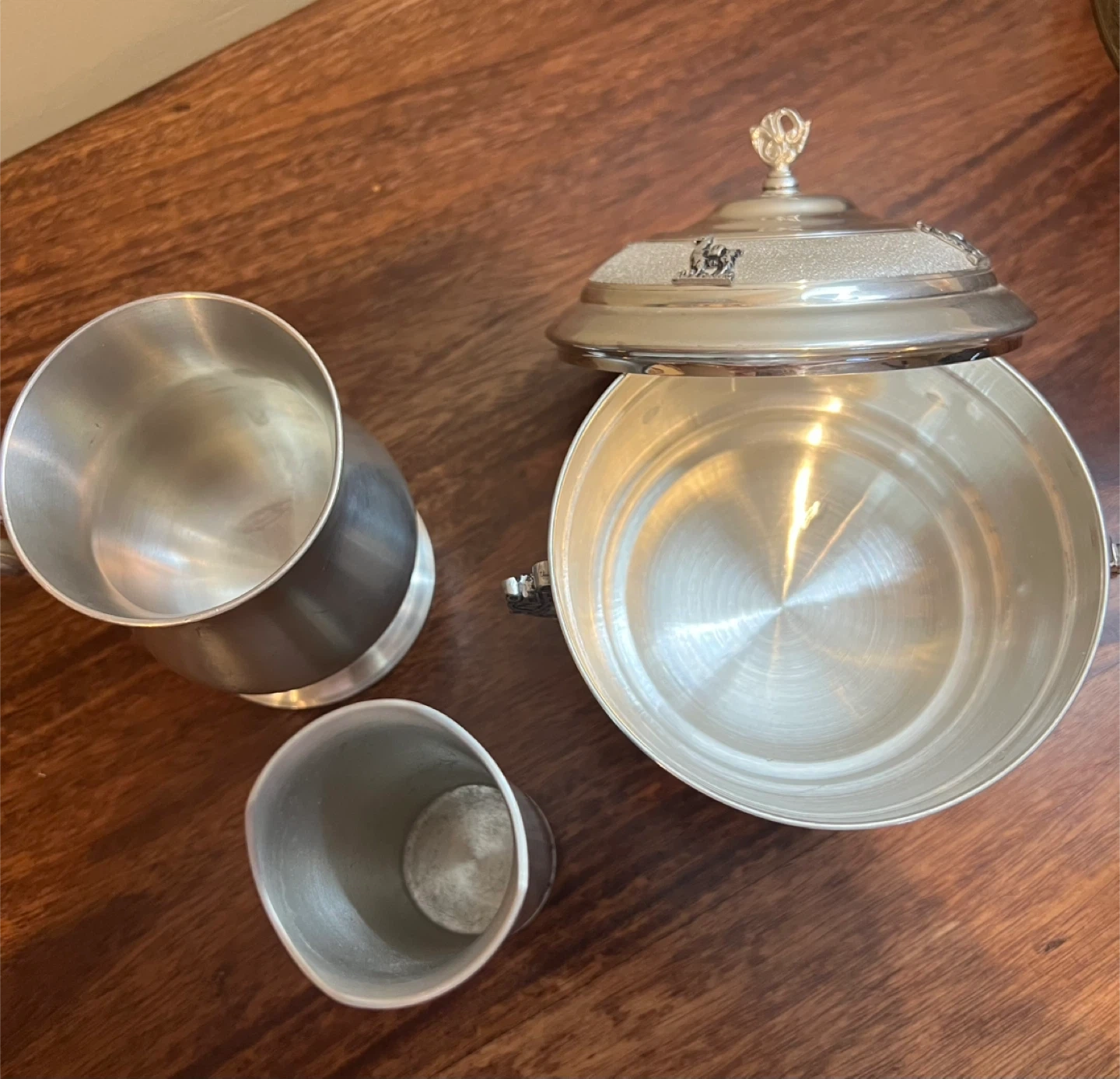 Three pewter pieces, each bearing intricate designs and a lustrous finish