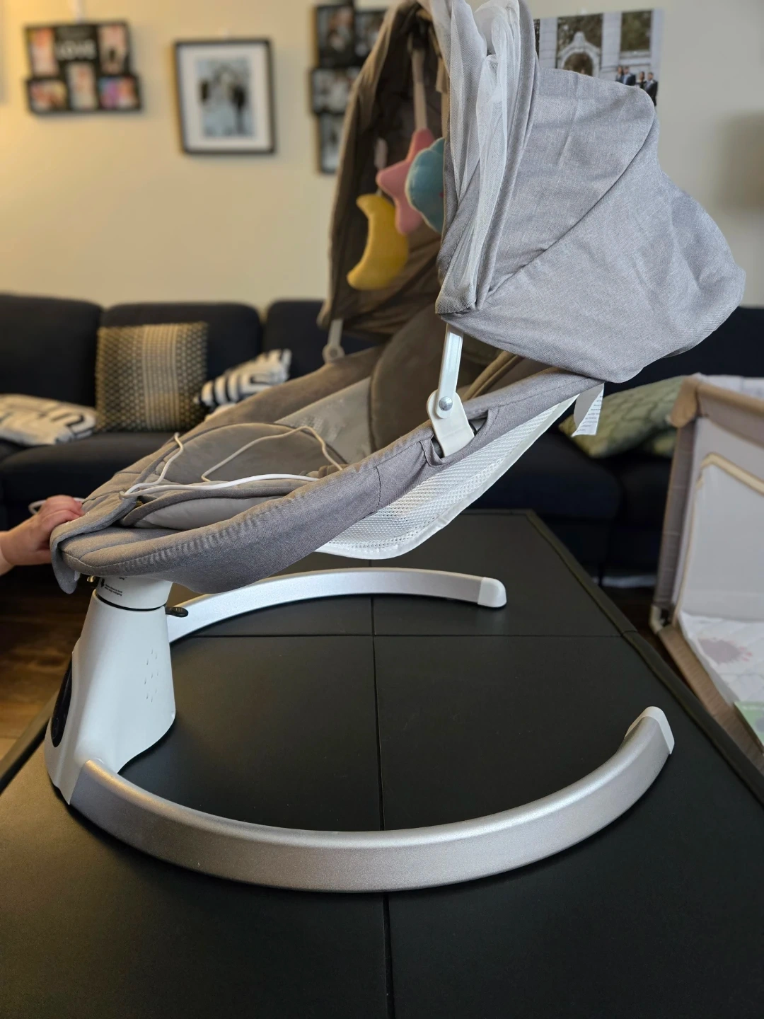 It's perfect for soothing your little one with its gentle motions and soft, cozy seat. The swing features a cute mobile with hanging toys to keep baby entertained. The colour is grey and is in prefect condition