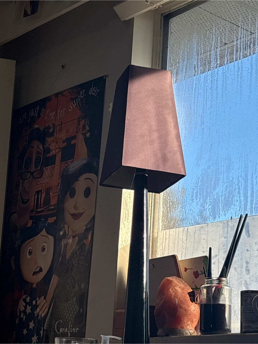 A stylish table lamp with a brown shade, perfect for adding a warm glow to any room. It's in great condition and ready to brighten up your space