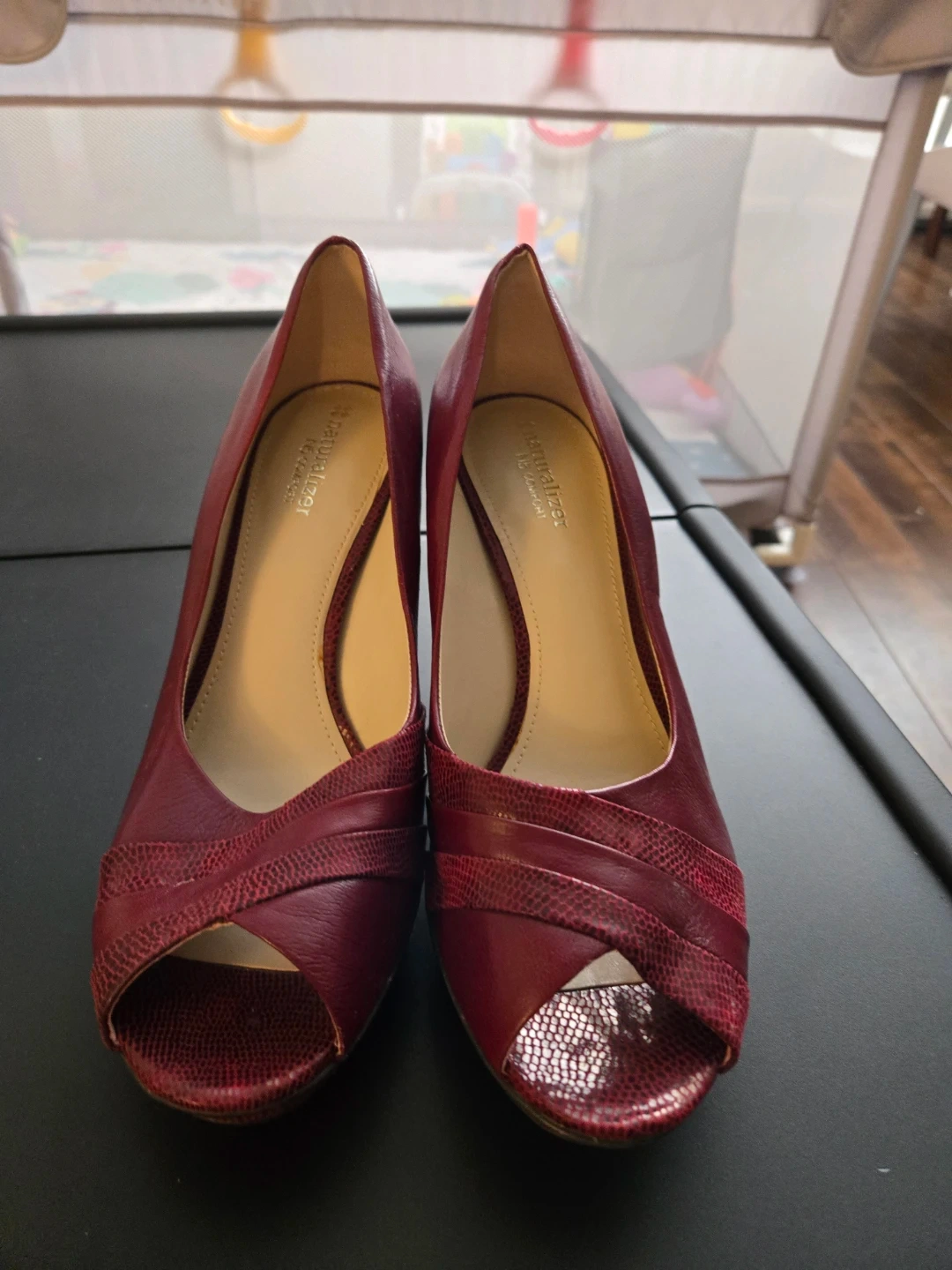 These Naturalizer heels are a beautiful red leather and in great condition! They are a size 10 and feature a peep-toe design. Perfect for adding a touch of elegance to any outfit