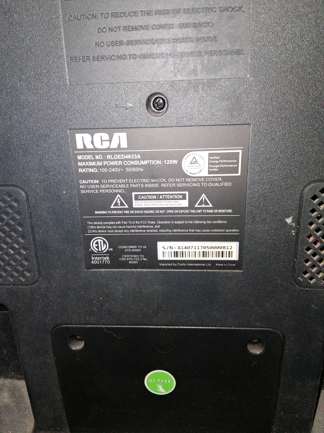 Selling an RCA TV, model number RLDE D4633A. It has a maximum power consumption of 120W and is rated for 100-240V ~ 50/60Hz missing power chord and remote